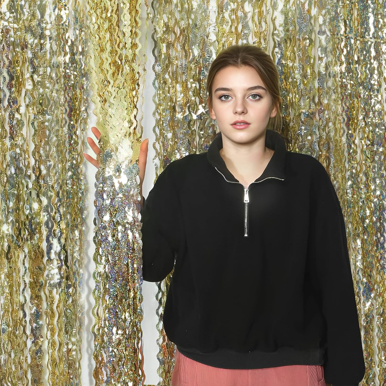 - Package Contents: 4 pack champagne gold wavy foil fringe curtains,each curtain is 3.3ft x6.6ft,You can cut the metallic backdrop into the suitable length for use,Wonderful accessories for decorating doors and walls