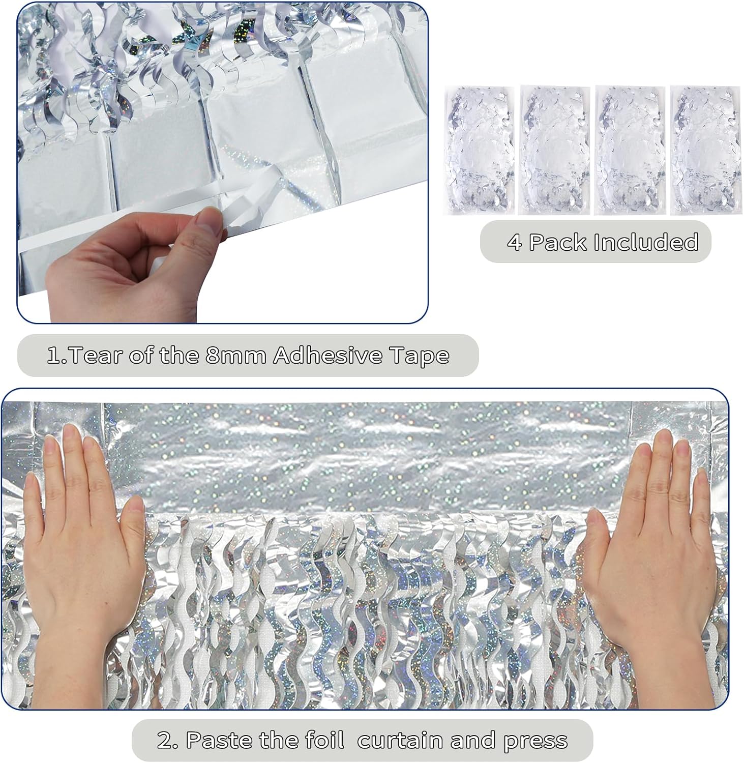 - Easy to Use: The silver foil curtain backdrop has double-sided tape on the top of the back,please peel tape off would be very easy to paste on smooth surfaces such as wall,window,table,door or anywhere you like
