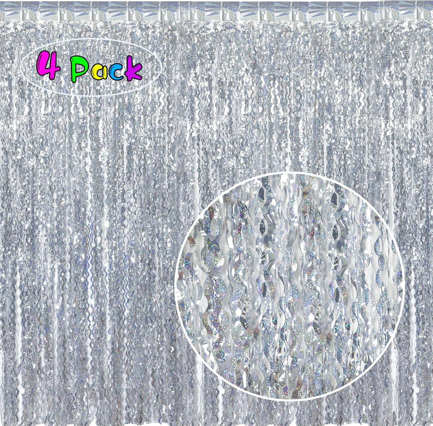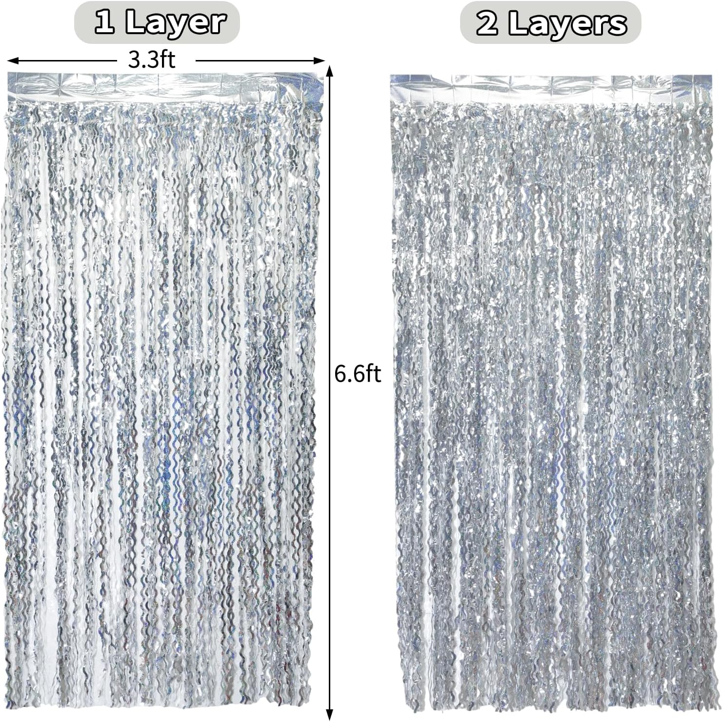 - Package Contents: 4 pack silver wavy foil fringe curtains,each curtain is 3.3ft x6.6ft,You can cut the metallic backdrop into the suitable length for use,Wonderful accessories for decorating doors and walls