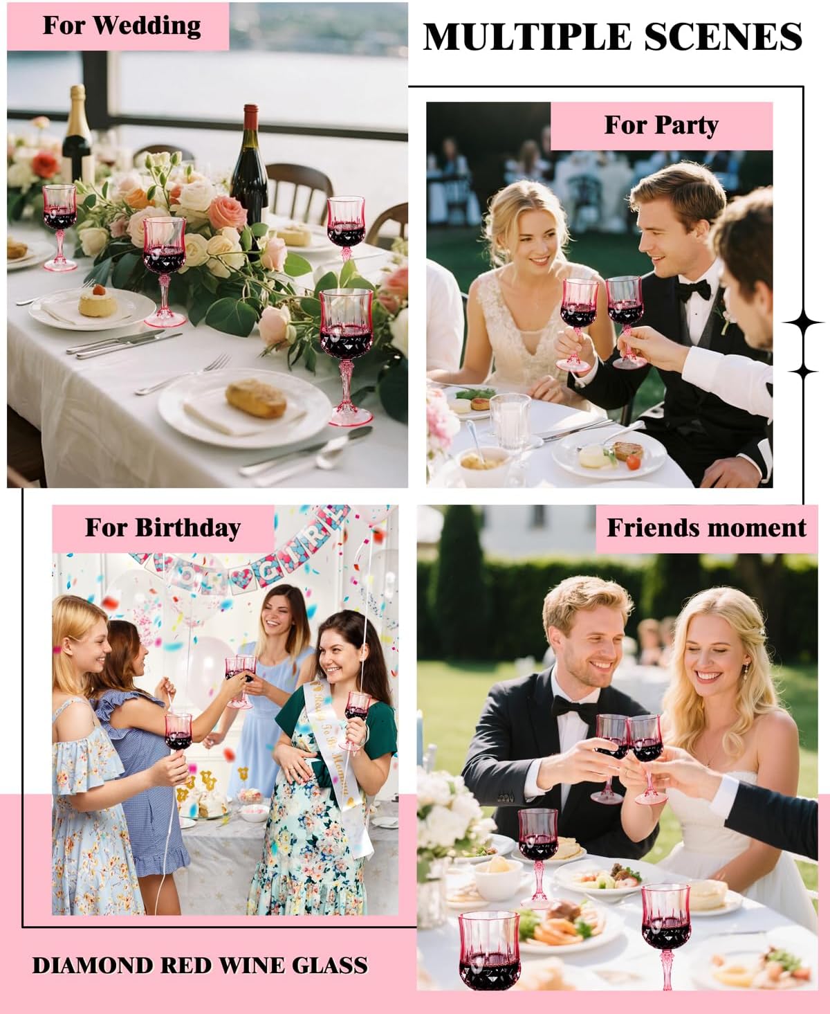 - Retro diamond-shaped pattern design: Imitating real crystal, plastic wine glasses have the charm of a vintage wine glass. Plastic wine glasses disposable’s retro design enriches the modern and classic dining table setting with an elegant atmosphere.
