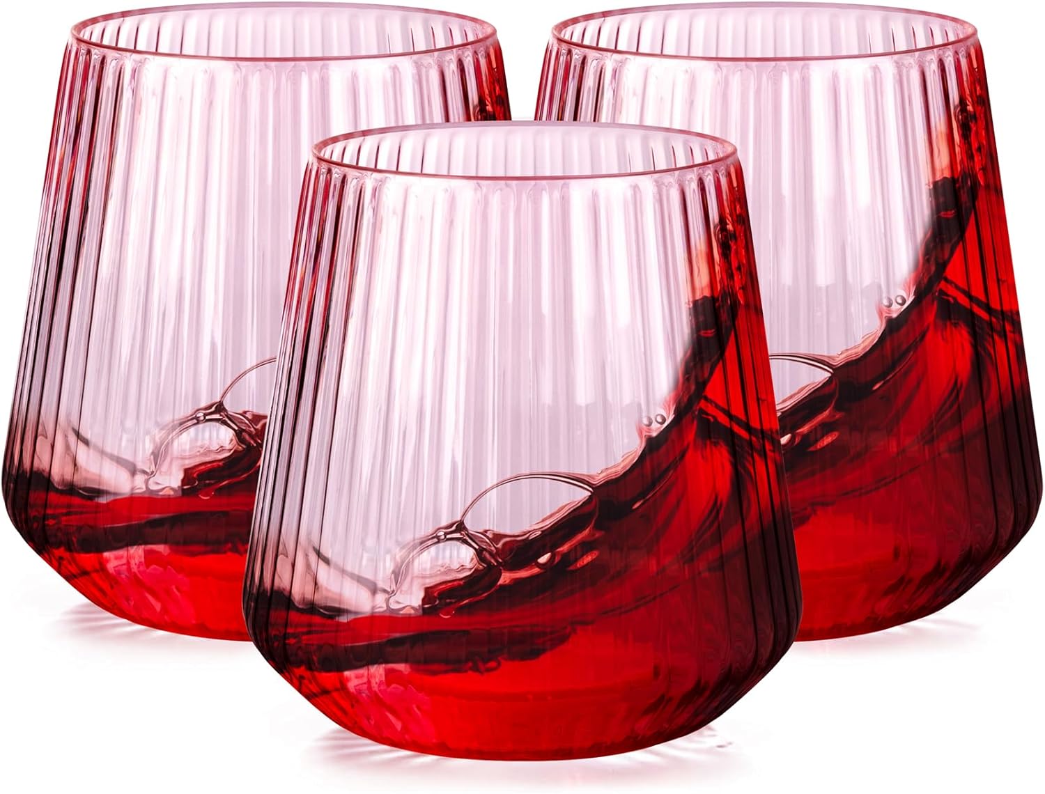 30 Pack Pink Plastic Ribbed Wine Glasses, 14 OZ Origami Stemless Disposable Wine Champagne Whiskey Glasses Unbreakable Clear Plastic Cocktail Glasses, Reusable Wine Cups for Party Wedding & Christmas