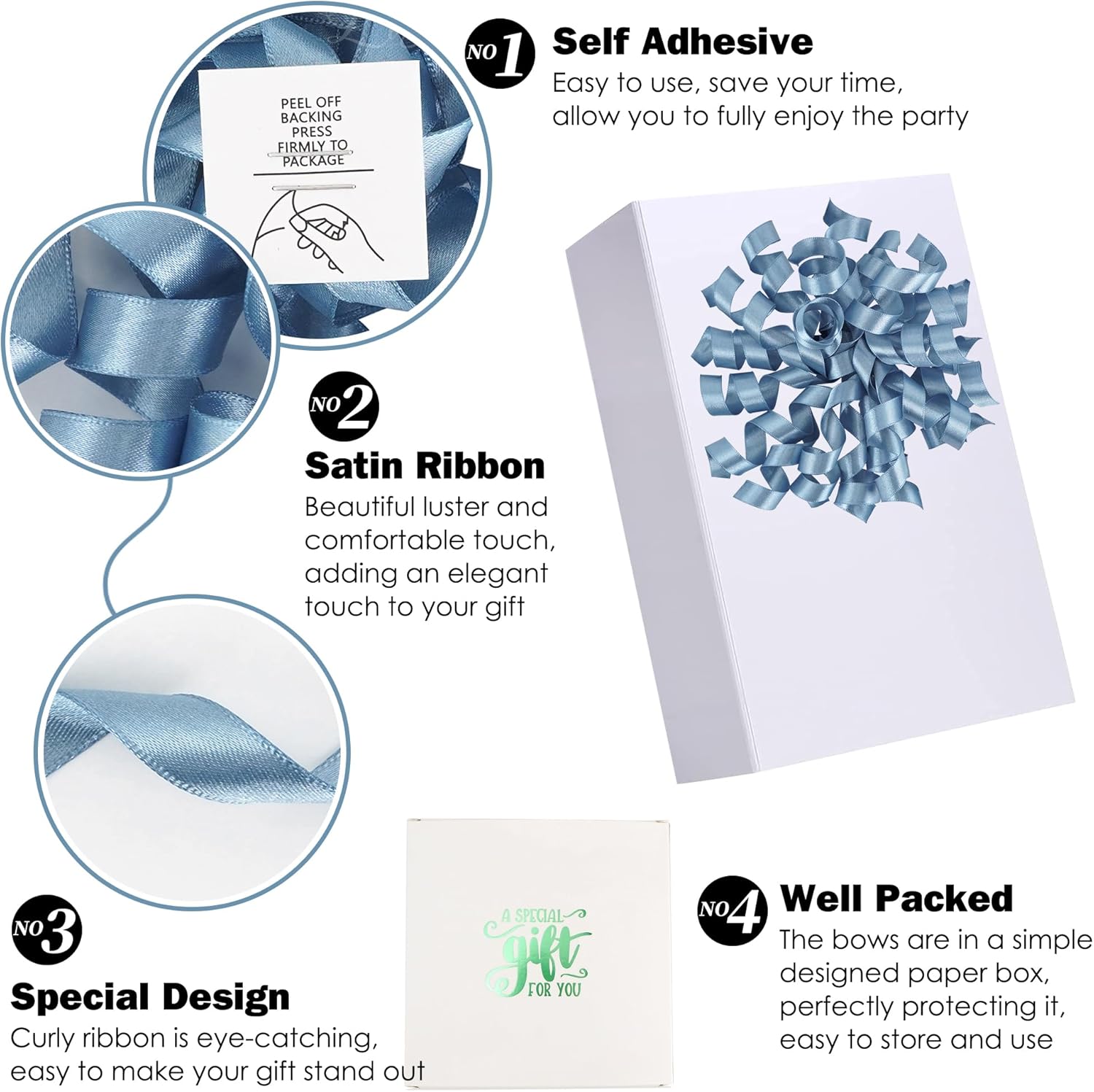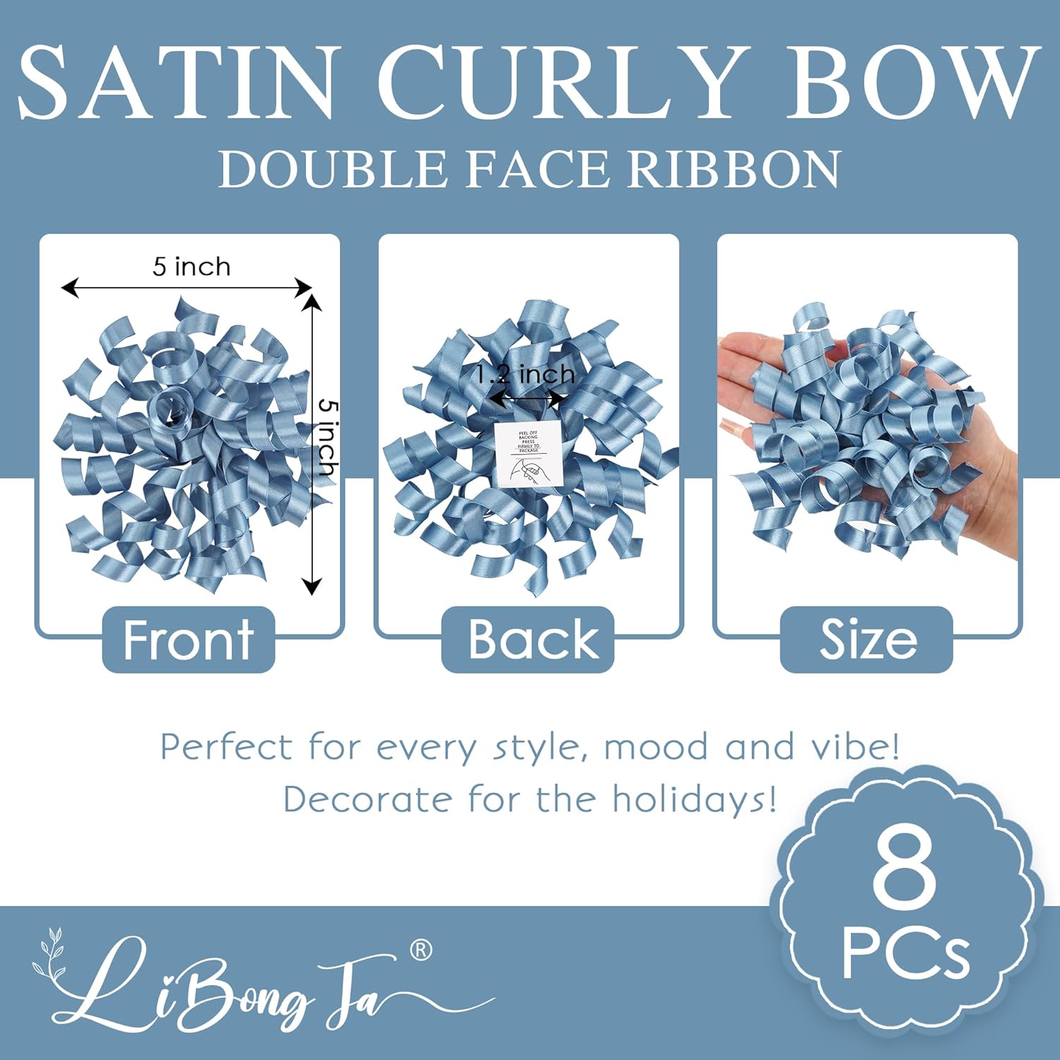 5'' Dusty Blue Bows Curly Ribbon Bows for Gift Wrapping, Satin Bows with Double-Sided Tape, Self Adhesive Bows for Party, Wedding, Birthday Decor, Premade Bows for Crafts, Wine Glasses-8 PCs