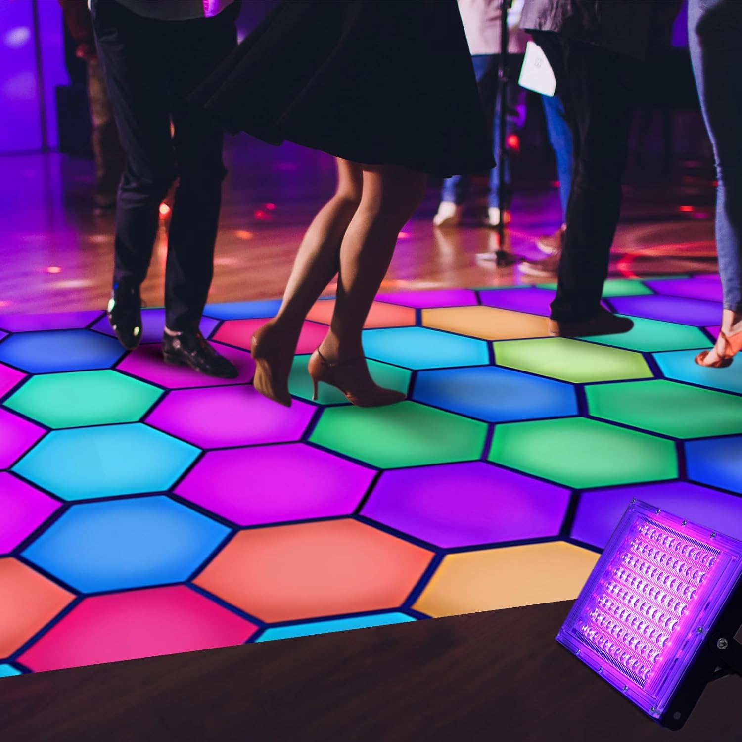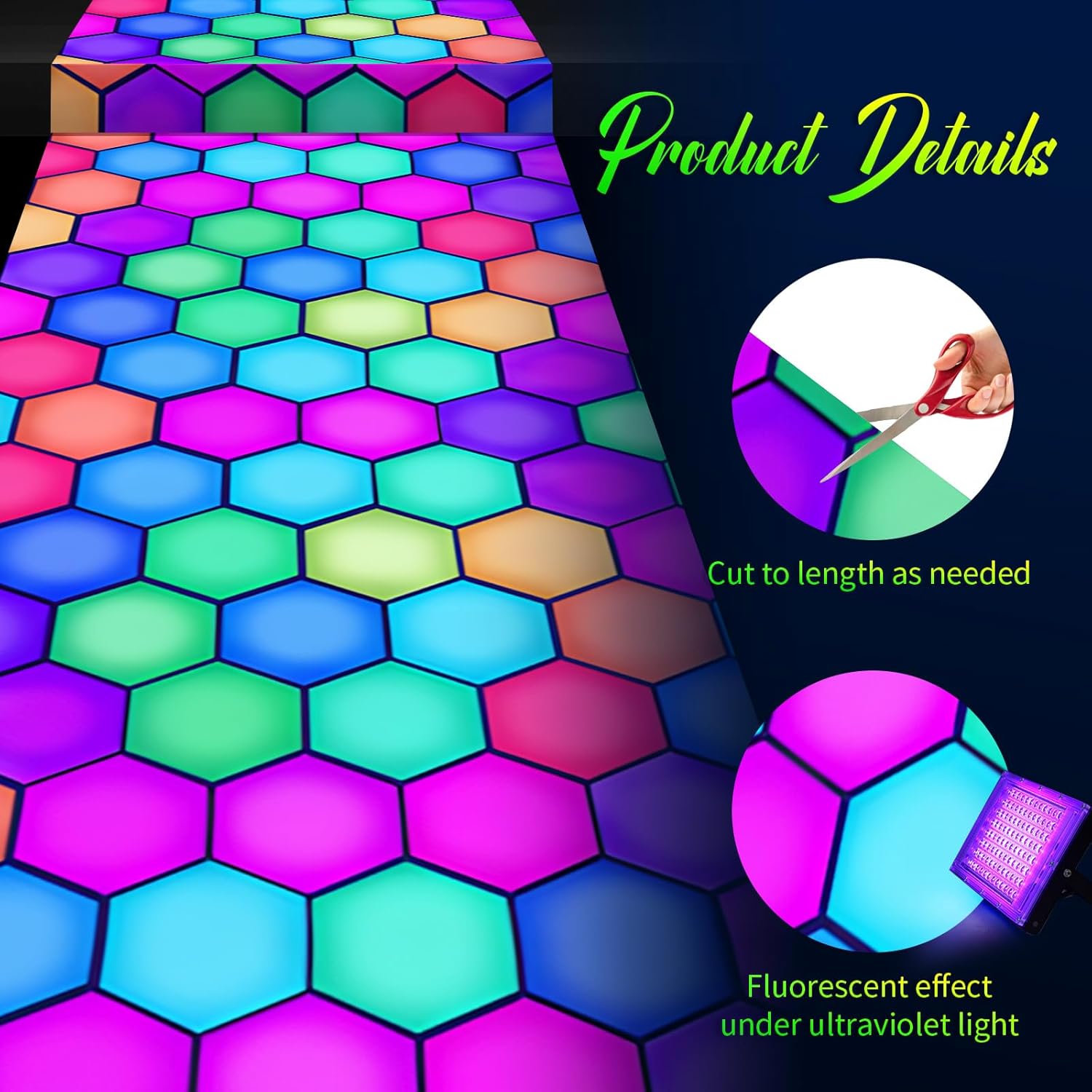 - Bright Fluorescent Color: the light up dance floor shines brightly under UV blacklight, with fluorescent orange, fluorescent red, fluorescent green, fluorescent yellow, and fluorescent blue hexagons staggered against each other, making it simple to draw the attention of others; Please note that it will have the effect of fluorescence, but it needs to be irradiated by purple lamp to have the effect; If it is not irradiated, it is a normal pattern