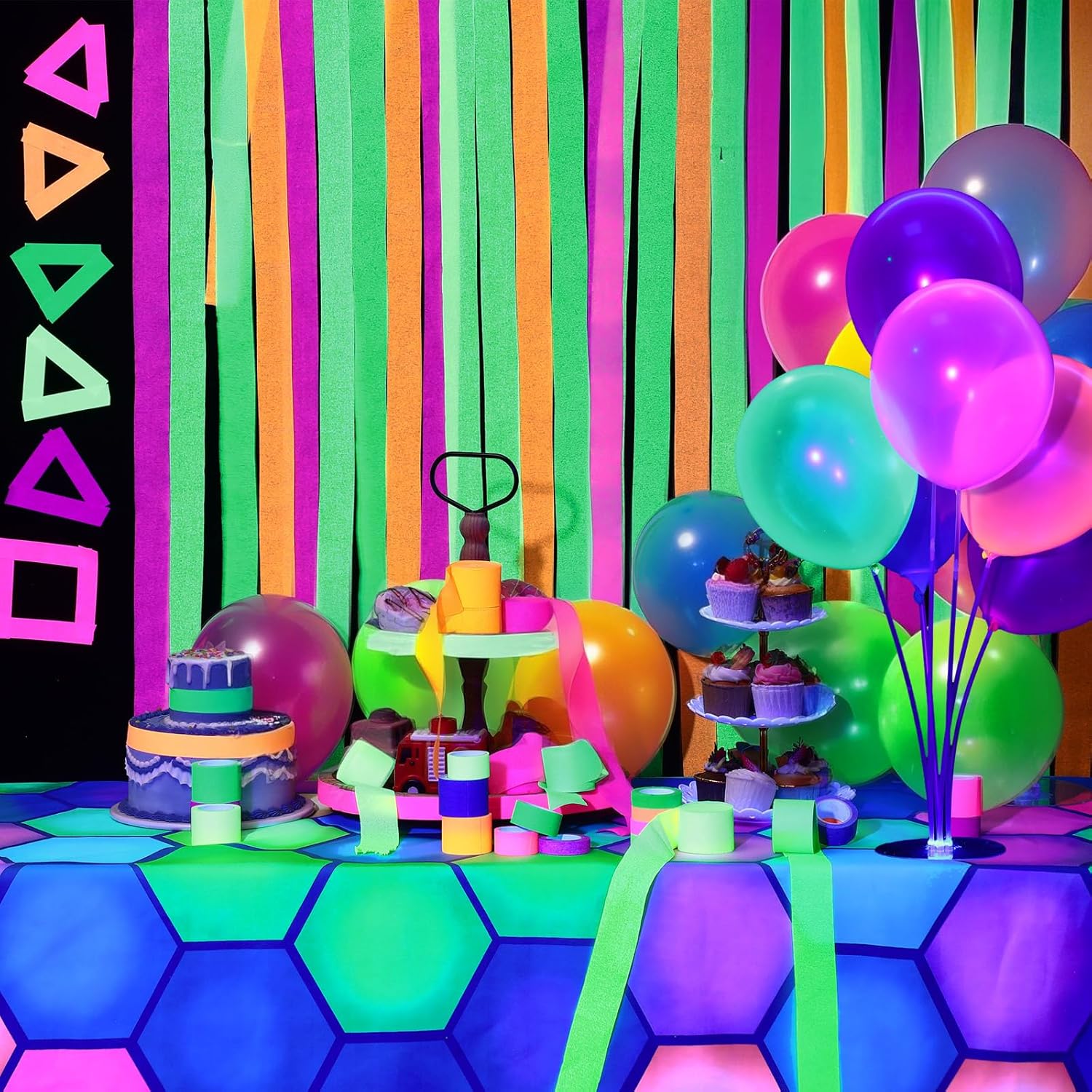 Haull 118 x 39 Inch Neon Light up Dance Floor Glow in The Dark Runner UV Reactive Blacklight Floor Aisle Runner Decor Wall Props for 80s 90s Neon Birthday Party Decorations(Hexagon)