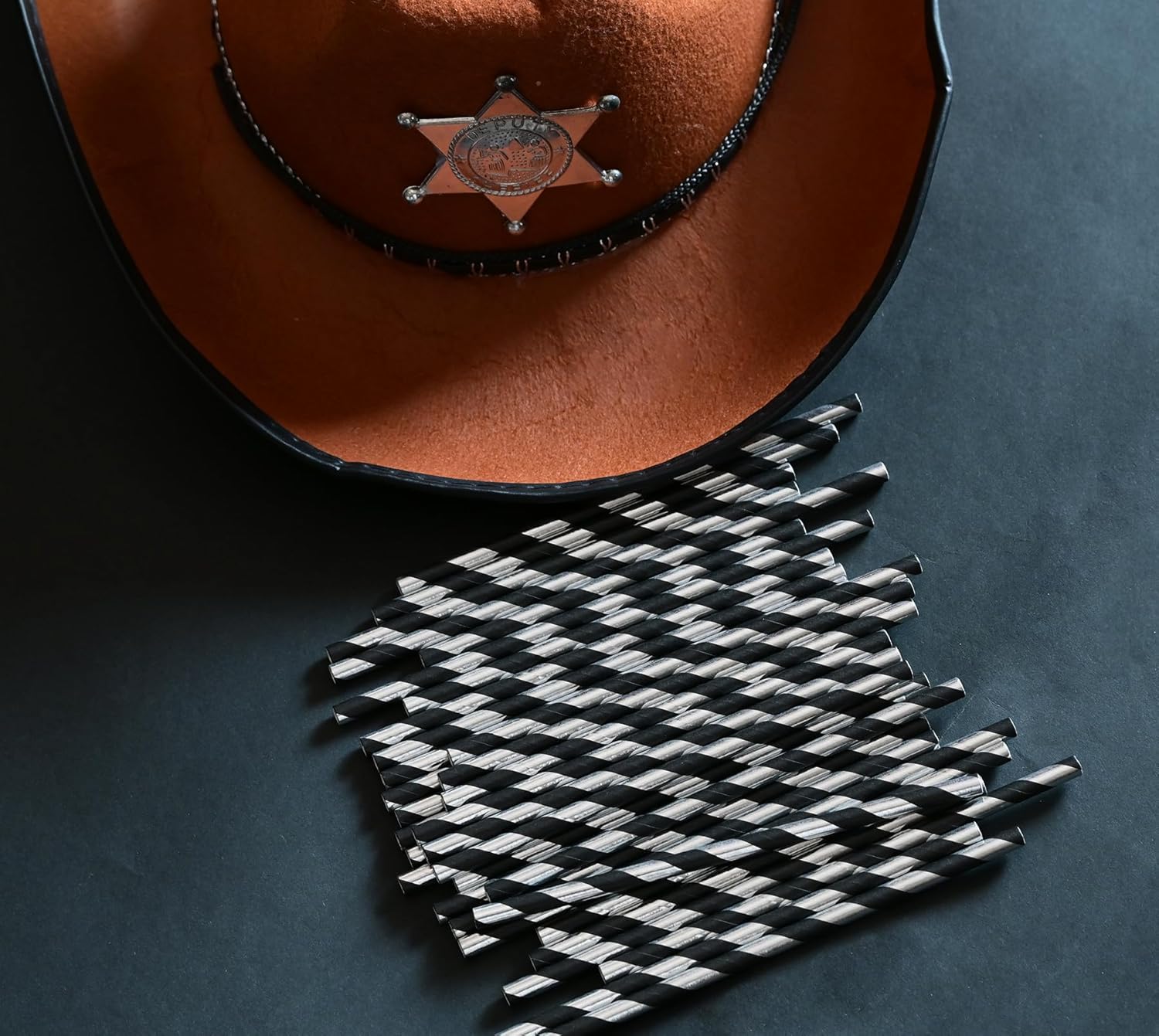 Cocktail Paper Straws - Black Silver Striped Biodegradable Disposable Drinking Straws for Brithday, Wedding, Holiday, Cake Pop Sticks - 5.75 inch