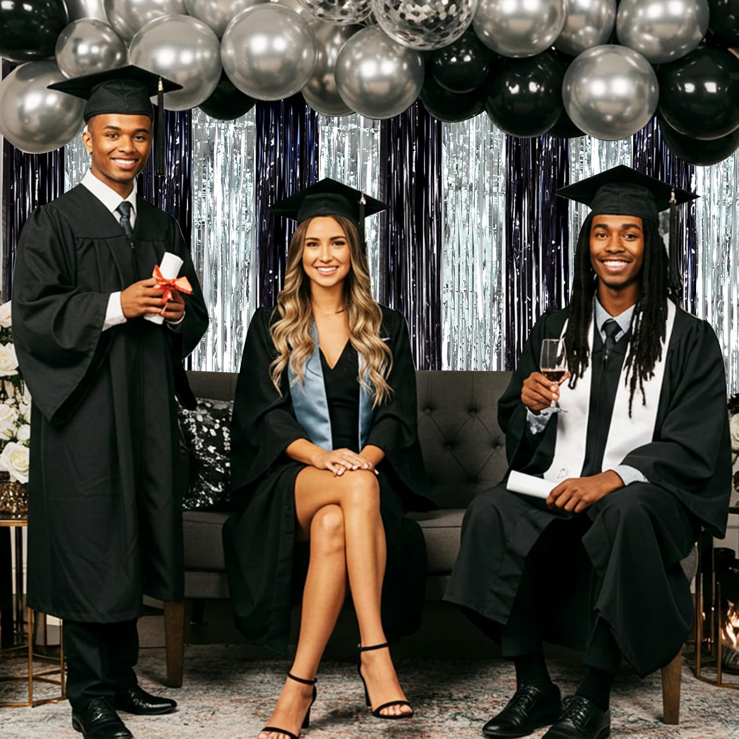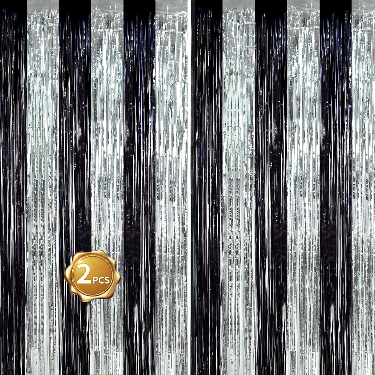 BEISHIDA 2Pcs Black Silver Door Streamers Congrats Grade 2025 Decoration Backdrop Foil Fringe Tinsel Party Streamers Curtains for Birthday Graduation Bachelorette Party Decoations (3.28 ft x 6.56 ft)
