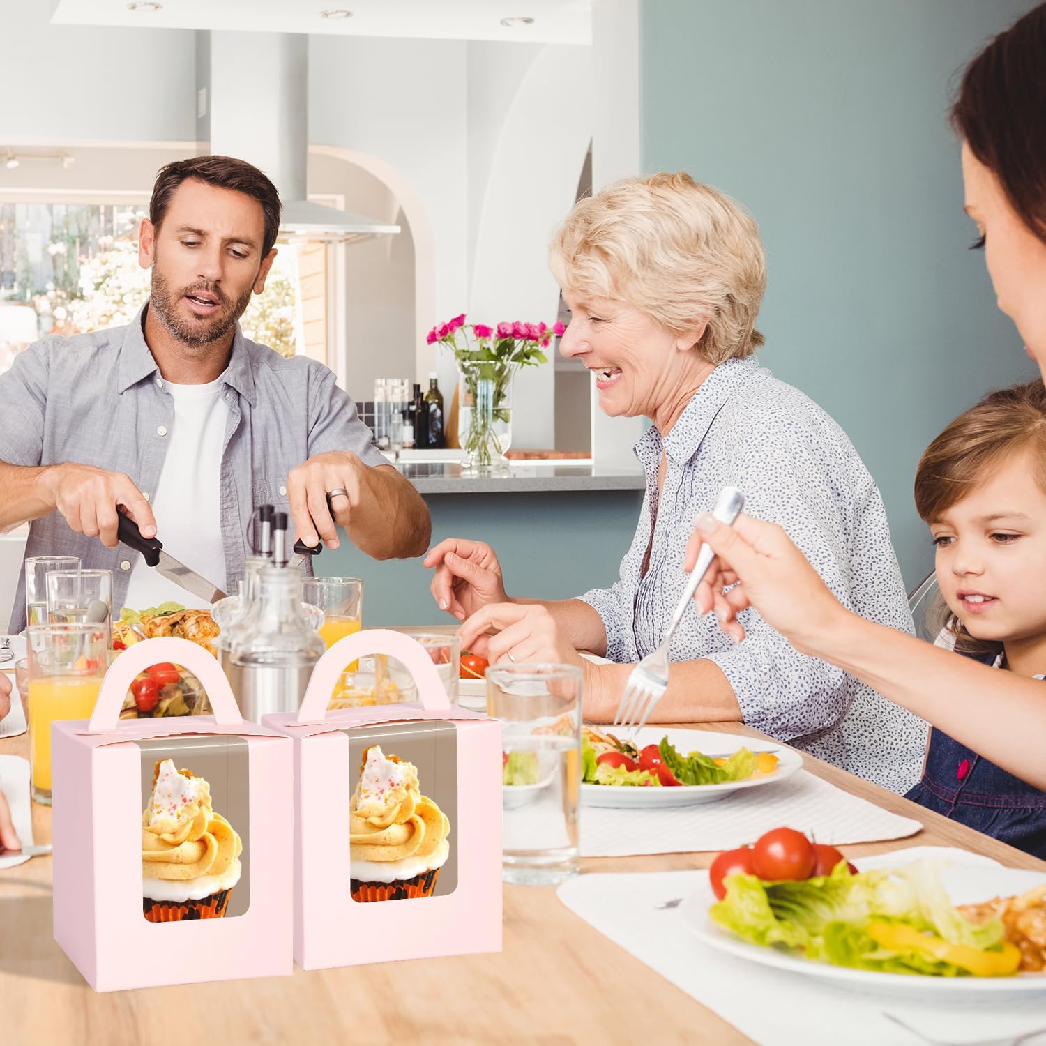 JCD Cupcake Boxes Carriers, 120pcs Pink Single Individual Cupcakes Box Holders Containers,3.7 * 3.7 * 4.3inch Cupcake Container Pastry with Insert Window & Handle for Parties (Pink/120Pcs)