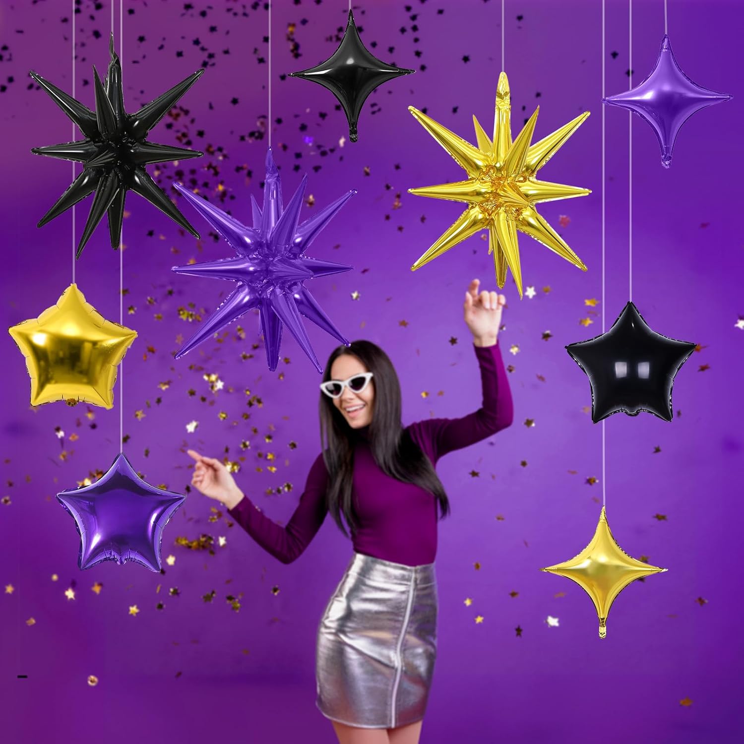 - Purple Gold Balloons Set: Package includes: purple, black, gold three-color aluminum foil star balloons (explosion stars × 3, four-pointed stars × 6, five-pointed stars × 6) , a straw and ribbon