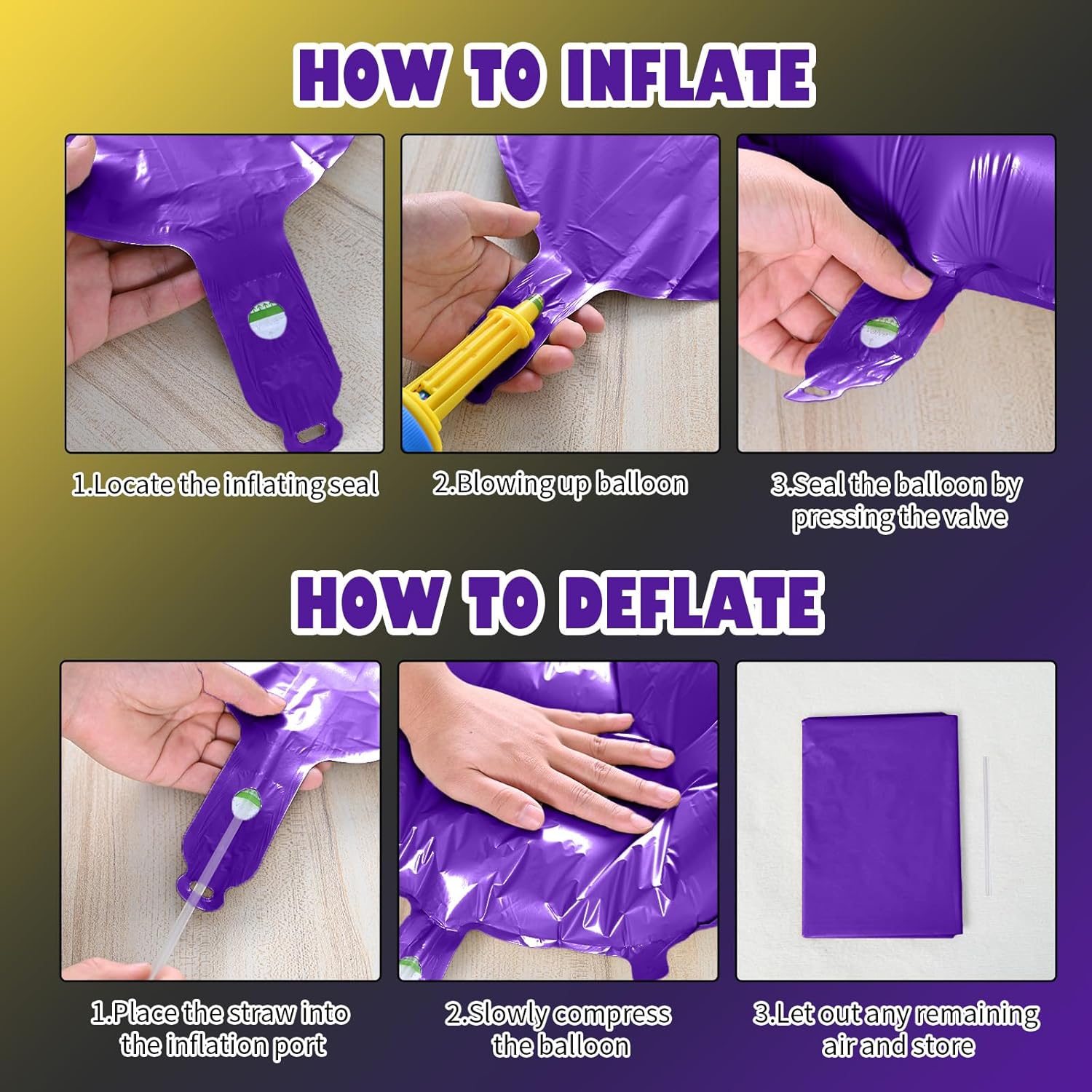 - Reusable Foil Balloons: The purple and gold star balloon set is completely reusable. Avoid excessive friction and sharp objects when using it. Use a straw to deflate and flatten it after event, and it will still be a shining decoration at the party next time