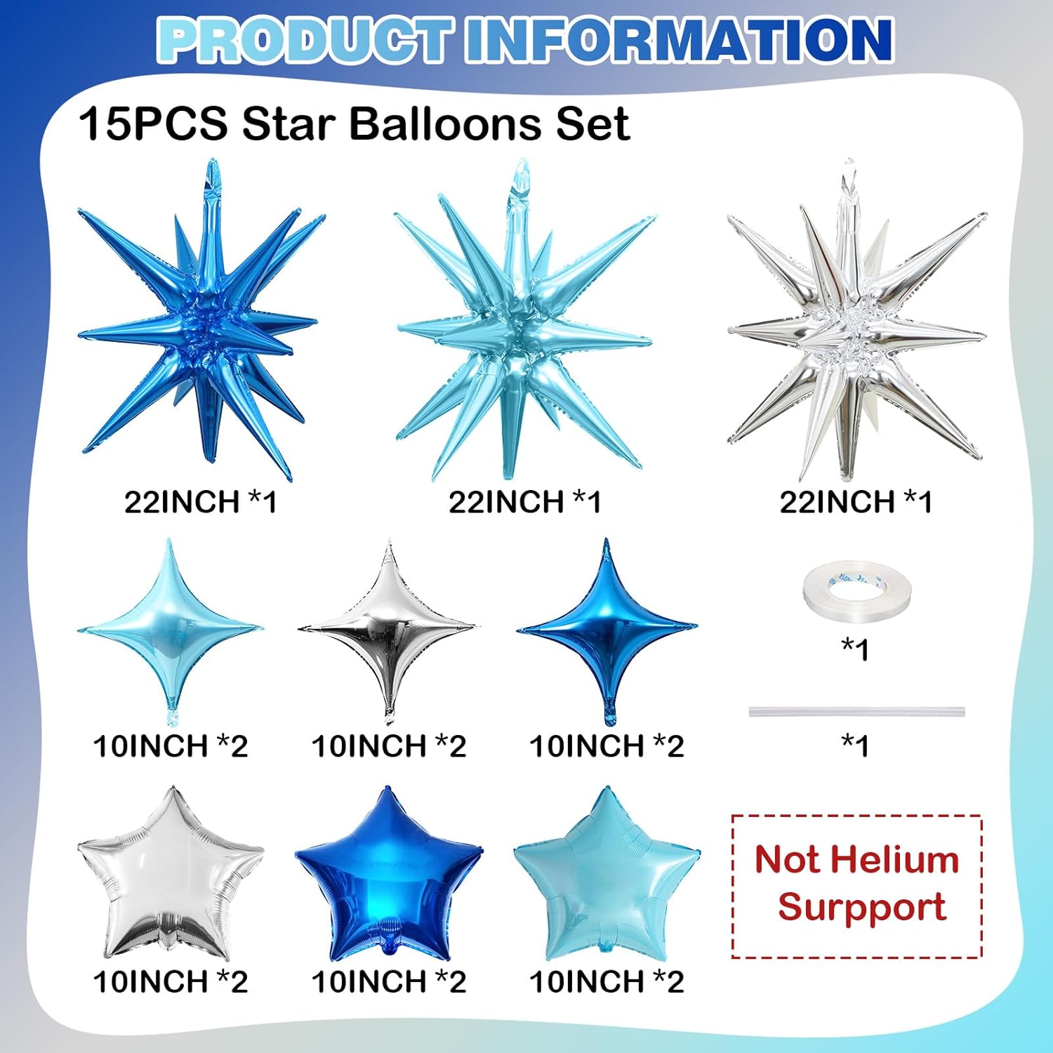 - Blue Silver Star Balloons: Package includes: dark blue, light blue, silver three-color aluminum foil star balloons (explosion stars × 3, four-pointed stars × 6, five-pointed stars × 6) , a straw and ribbon