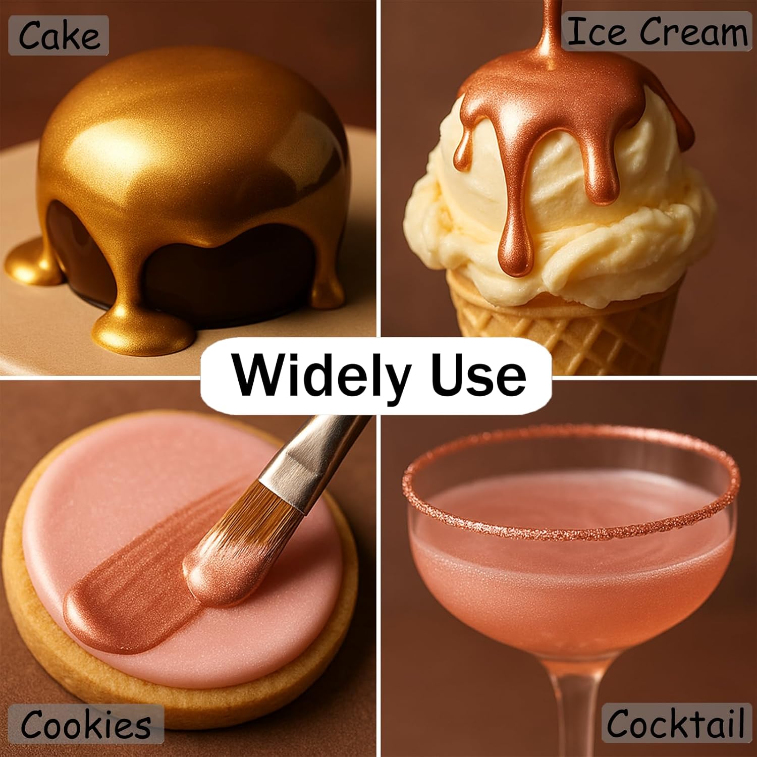 - 🥂 Easy to Use, Versatile & Mess-Free– Apply with a brush, sponge, or airbrush—smooth consistency dries quickly without cracking. Works on fondant, buttercream, glass rims (for cocktails), and even fruit!