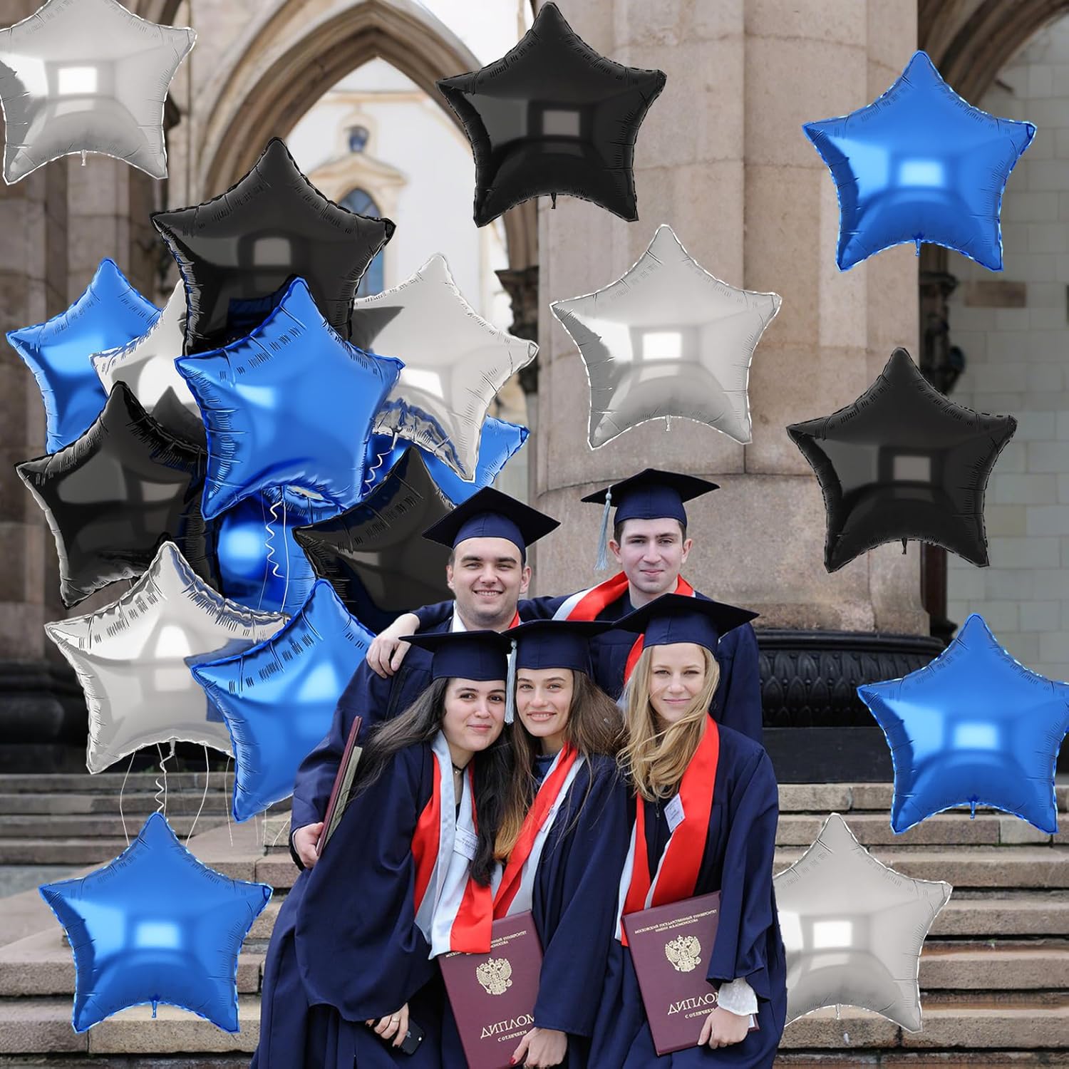 - Black Blue and Silver Stars Party Balloons: This 12Pcs blue black foil star balloons set designed with Giant 18 inch pentagram foil balloons, includes blue star mylar balloons, black star mylar balloons and silver star mylar balloons, each balloons set comes with a straw and ribbon
