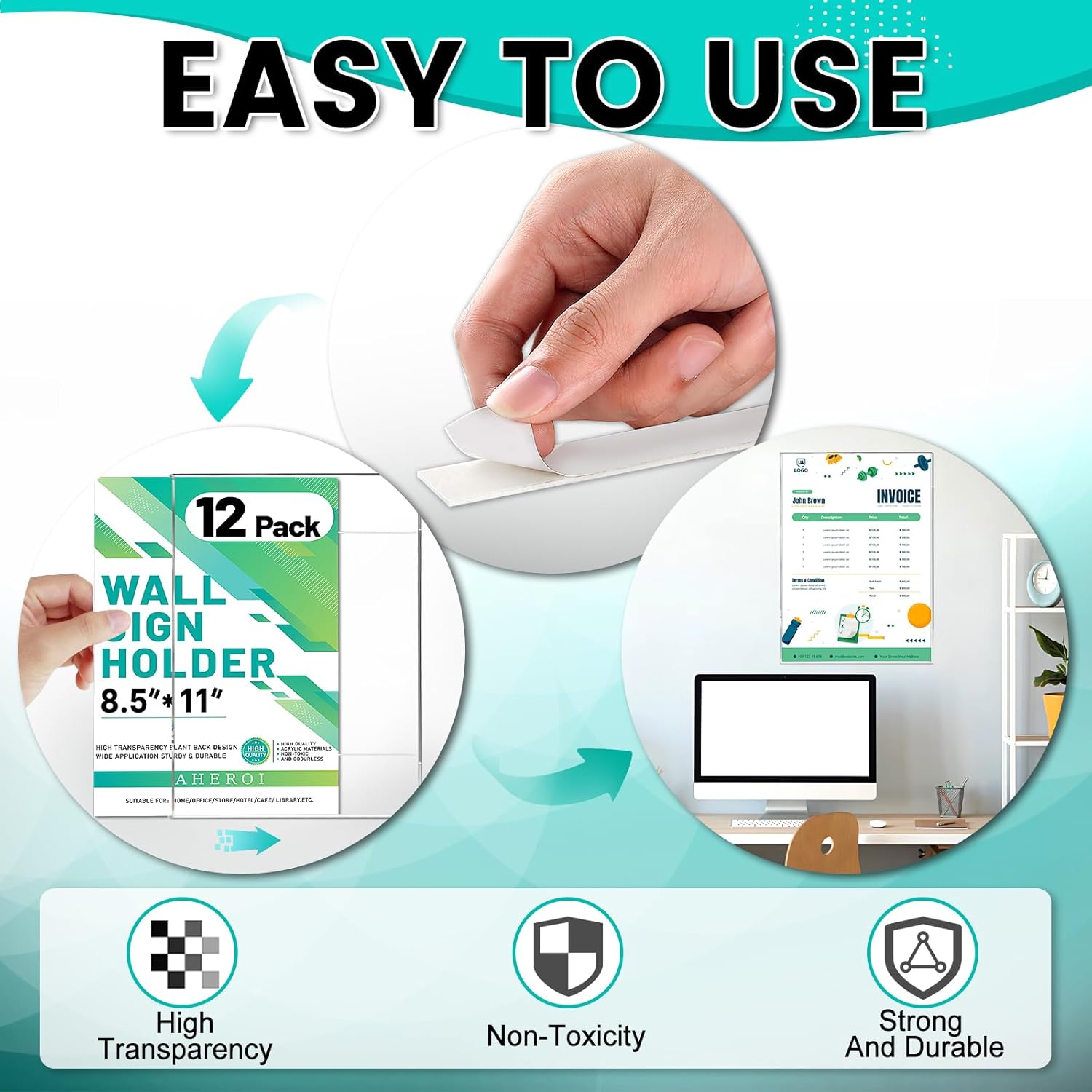- Super Adhesive Tape: You will receive 12pcs acrylic wall sign holders with super adhesive tape. NOTE: Our tape is not glued to the acrylic wall sign holders, it comes with the package, this is to make it easier for you to cut your own as needed. Each clear wall mount frame measures 8.5*11 inches and will fit most occasions