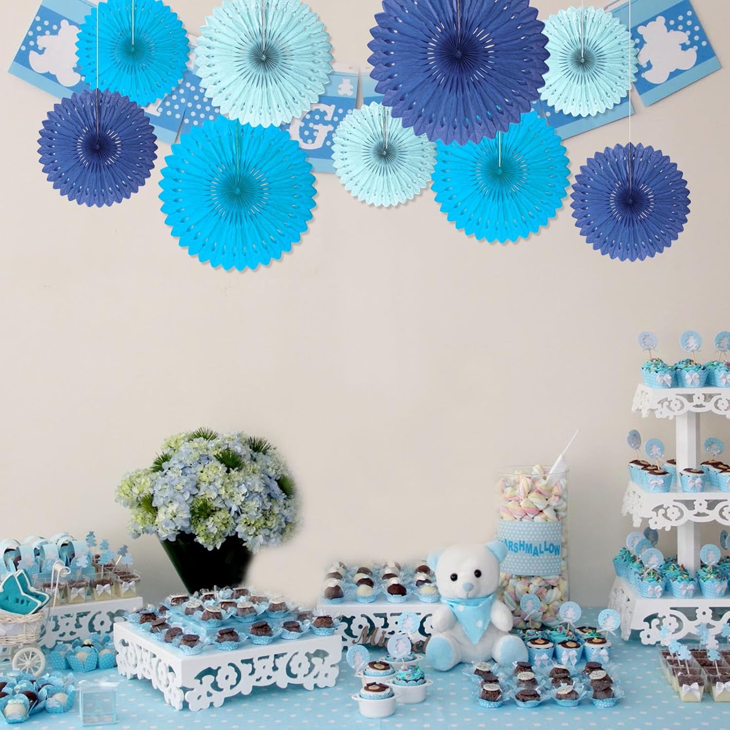 18 Pcs Blue Kit Hanging Honeycomb Paper Fans, Round Paper Fan Decorations for Weddings, Birthdays, Bachelorette, Photo Booth Backdrops, Baby Shower, Anniversary Events Party Supplies
