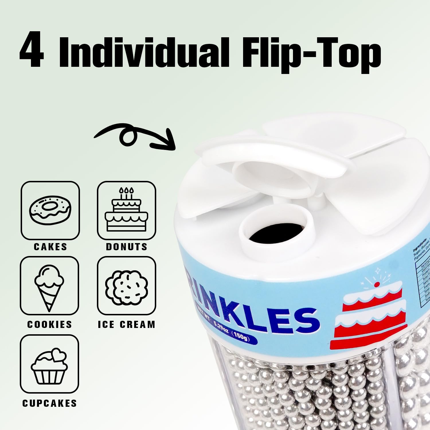 - Mix size Silver Pearl Sugar Sprinkles can meet the needs of decorative production of a variety of bakery products, with a high cost-effective. Pearl Sugar Sprinkles suitable for cakes, cookies, Ice cream, Cupcakes other Foods. 1 bottle of sugar sprinkles makes 3-5 cupcakes or one 3-inch diameter cake. After baking, you can place pearl sprinkles on top of the cake as decoration.
