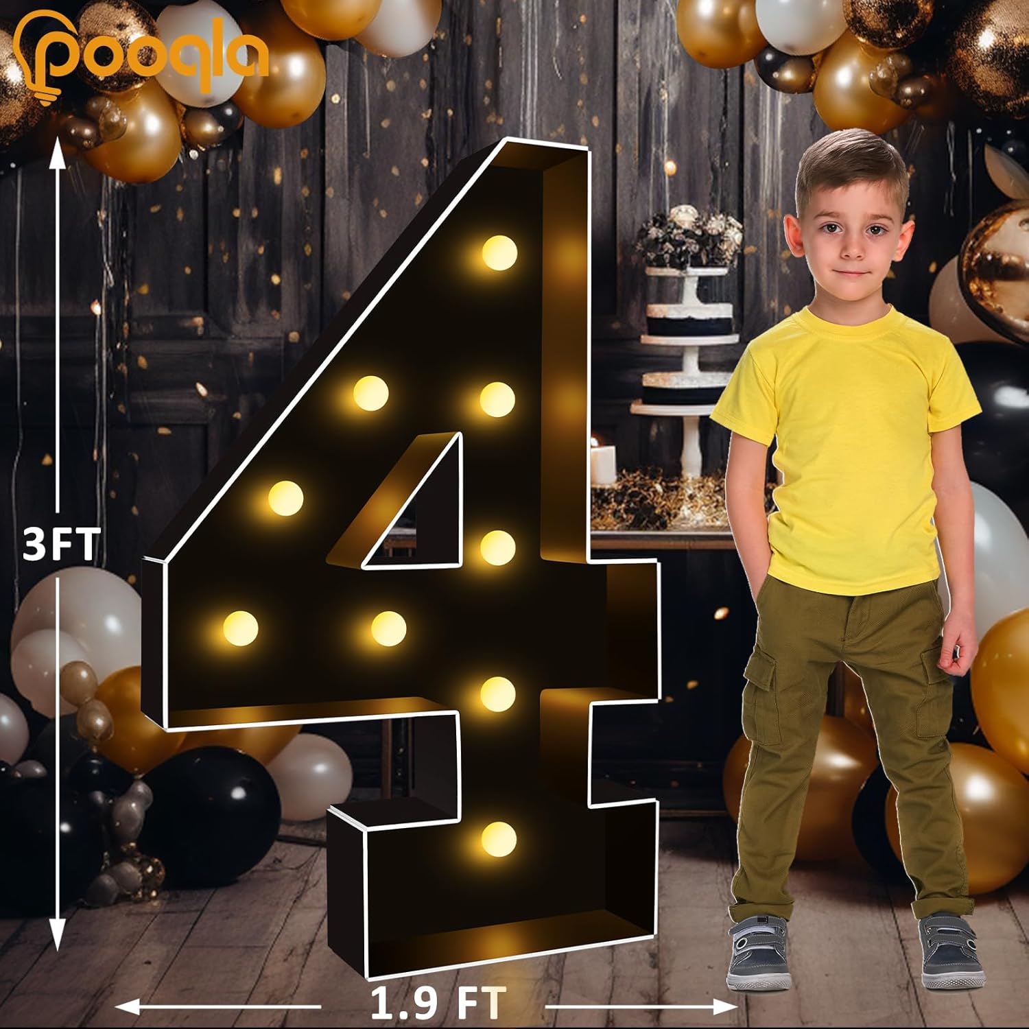 Pooqla 3FT Marquee Light Up Numbers, Black Lighted Party Decor for her him Women Men, Giant Mosaic Light Up Numbers for 4th 14th 40th Birthday Anniversary Decoration, Number 4