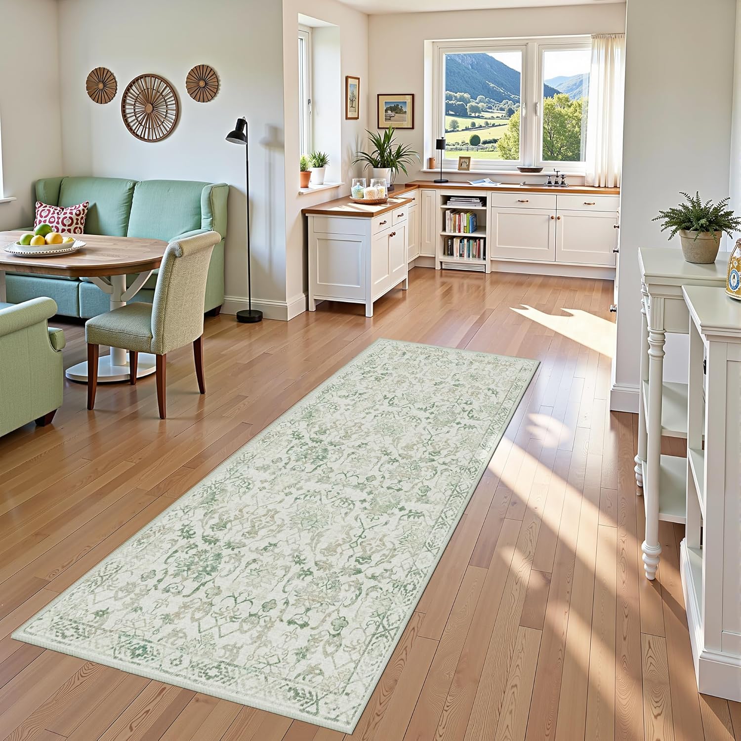 - Deerly Vintage 3x7 Runner Rug: These Hallway runner rug feature trendy faded style and unique neutral distressed floral pattern, vintage tones combines the green and ivory color, creating a comfortable and warm family environment. 3x7 rug runner is suitable for indoor entrance, bedroom, kitchen, bathroom, etc.