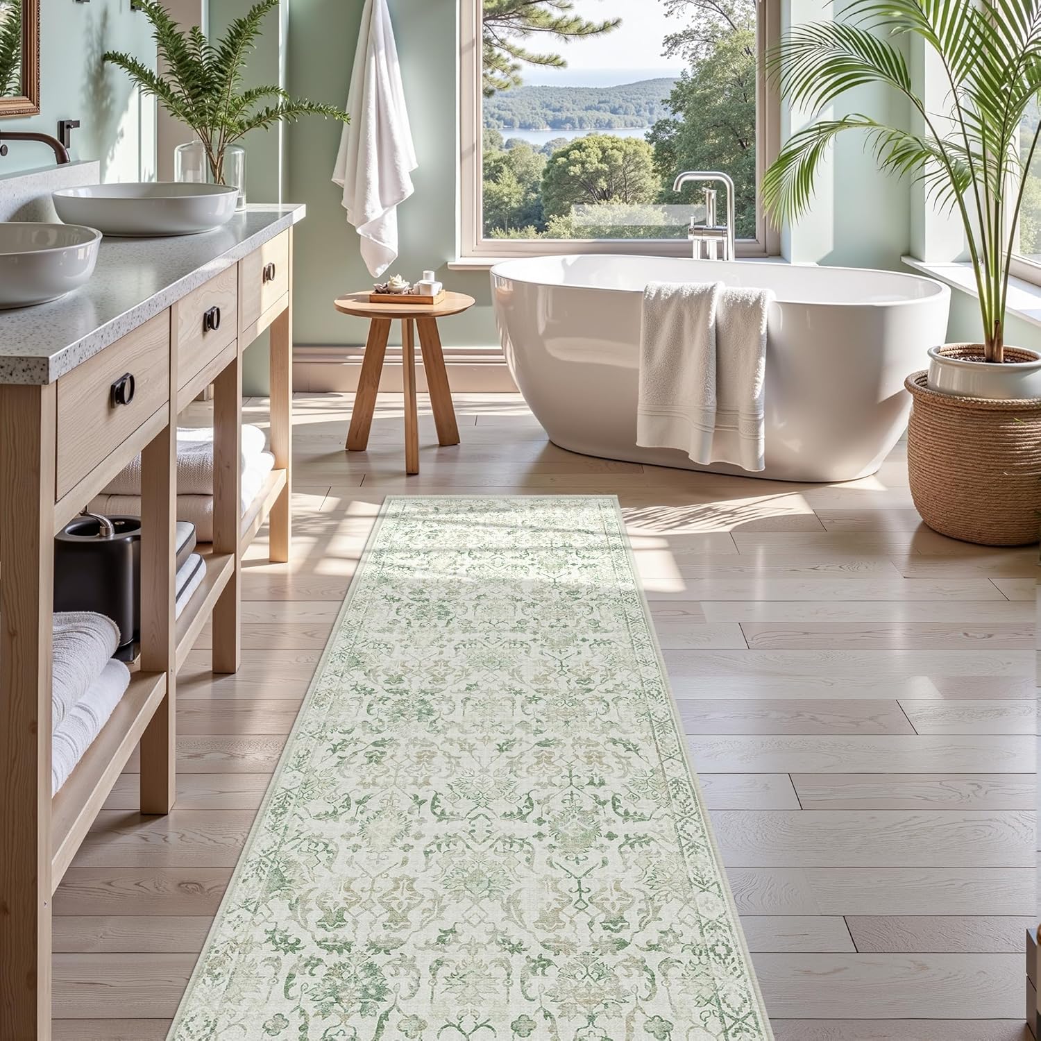 - Easy to Clean Washable Runner Rug: Say goodbye to hidden dirt and debris. The 0.2 inch low pile of this bathroom runner rug keeps most dirt on the surface, you can clean it regularly with a vacuum cleaner, broom or rag. For deep cleaning, machine washing is available and it won't easily deformed and still as a new antique rug.