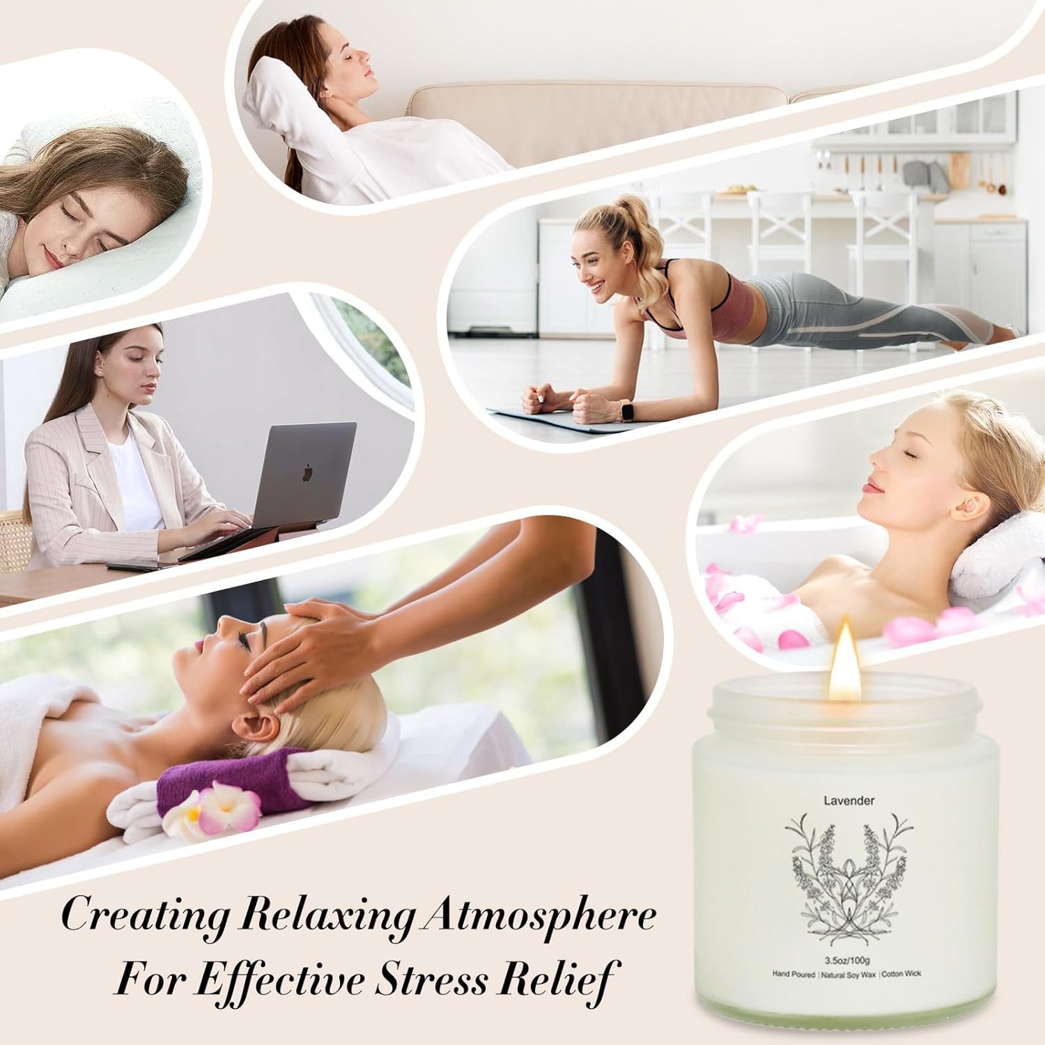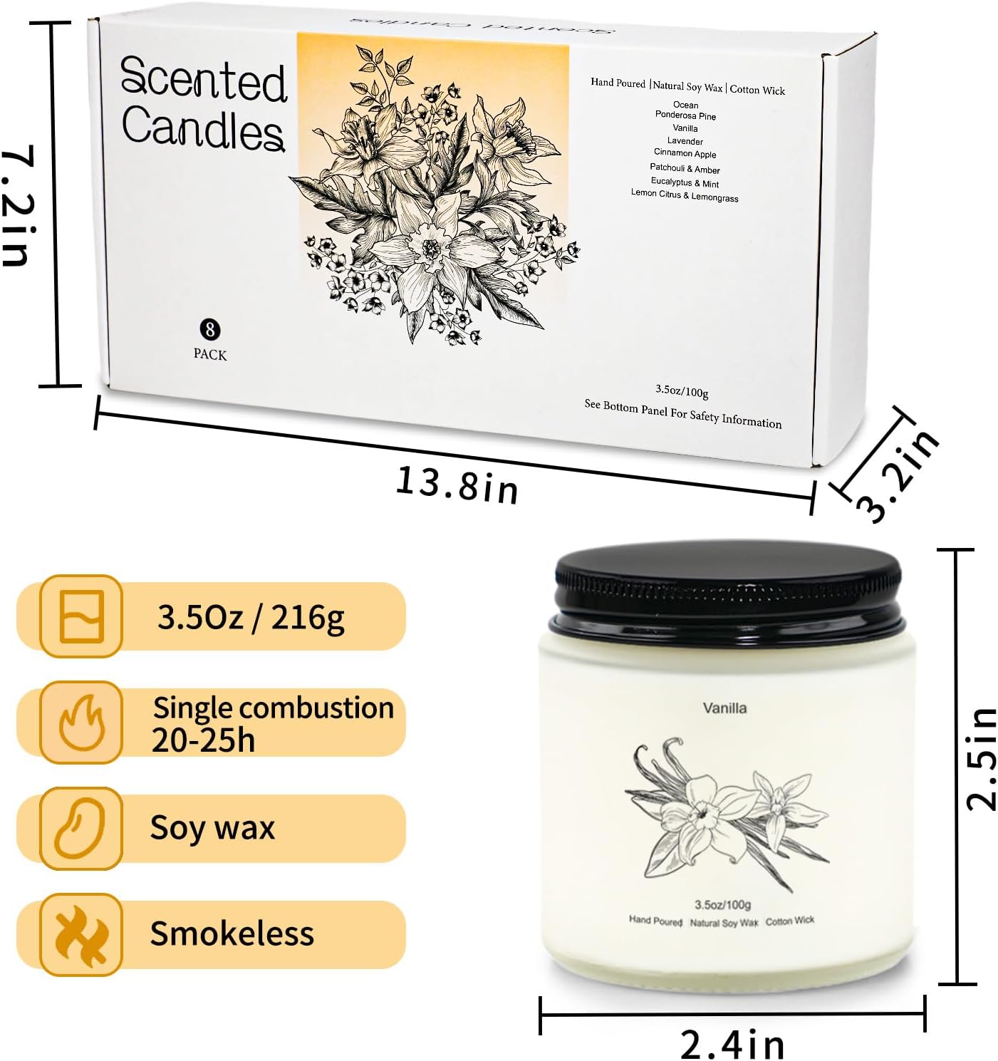 - 8 Pack Candles Set: Our aromatherapy candles set has 8 different scents, Cinnamon apple,Eucalyptus Mint,Lavender,Lemon Citrus&Lemongrass,Vanilla,Ocean,Ponderosa Pine,Patchouli&Amber scents.each of which exudes a unique scent, Familiar and pleasantly scented candles for stress relief, relaxation and improved sleep quality.