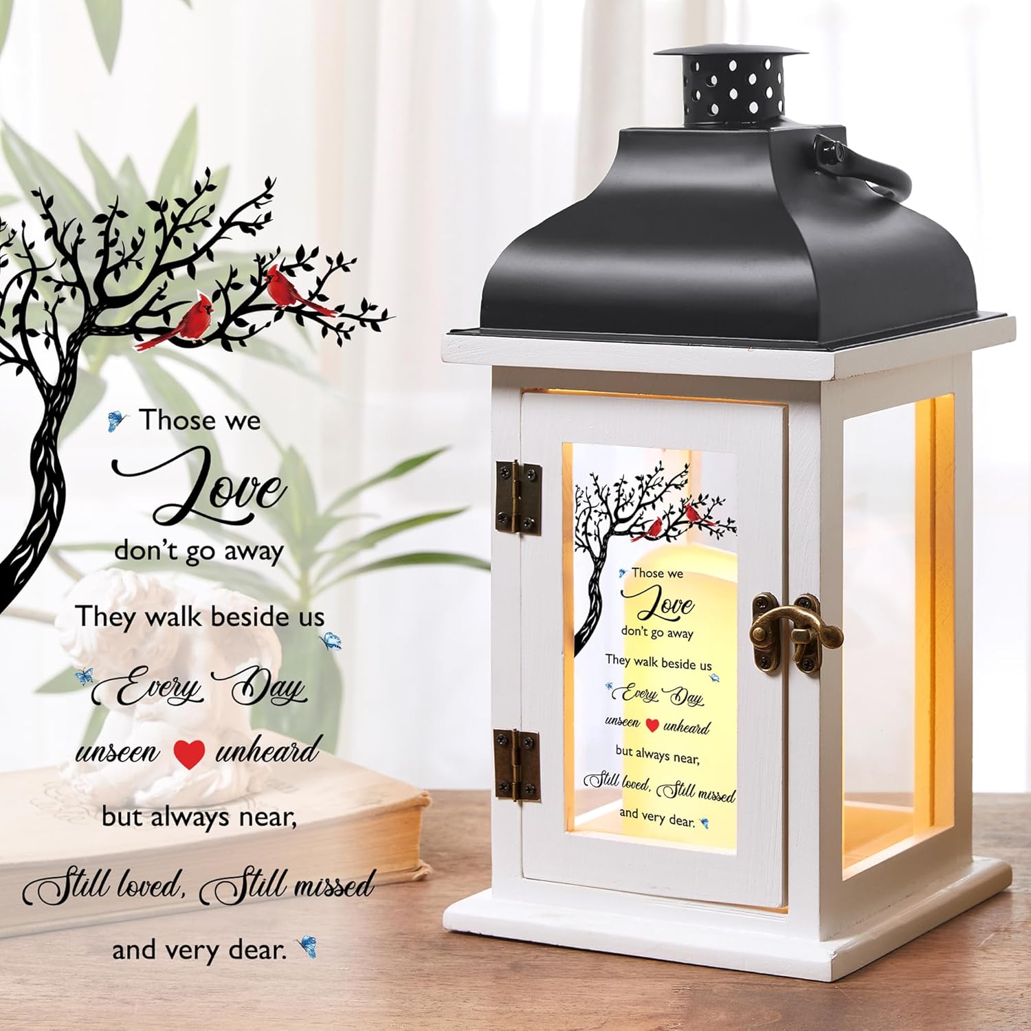 - Beautiful Memorial Lantern. Size: 14 x 5.8 x 5.8 inch. Made of solid wood with white paint. And the funeral lantern top is made of quality metal with black paint. The loop black metal handle is a great addition, assisting in carrying it around. The front acrylic panel features cardinal bird, tree and heart-touching words. Elegant, clear and never fades away.