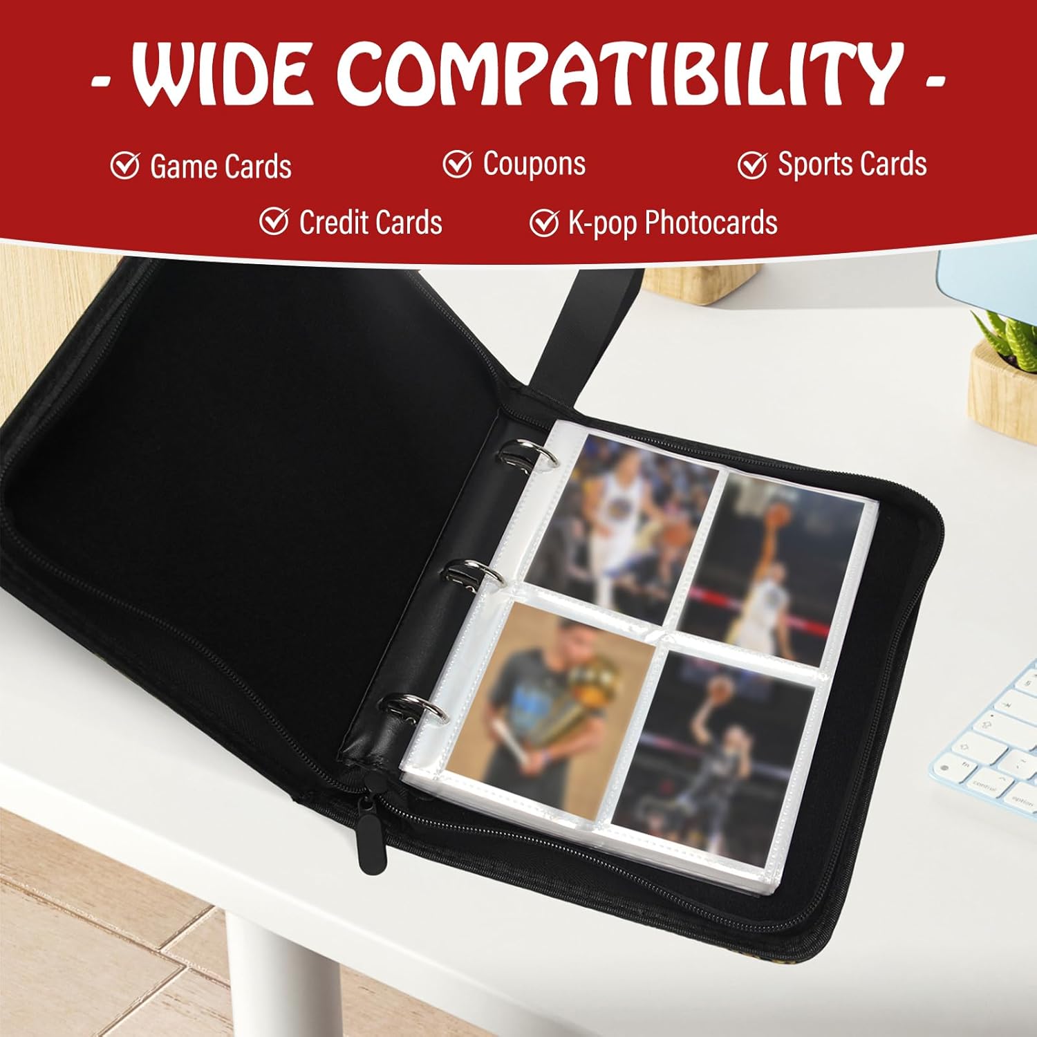 - Large Capacity Size: Inside page size: 2.68*3.5in,The card binder comes with 50 removable sleeves, which can hold up to 400 trading cards with 4 pockets on each side, allowing you to store cards on both the front and back.The trading card binder case is compatible with svarious standard-sized cards, Game Card , Football cards, Baseball cards