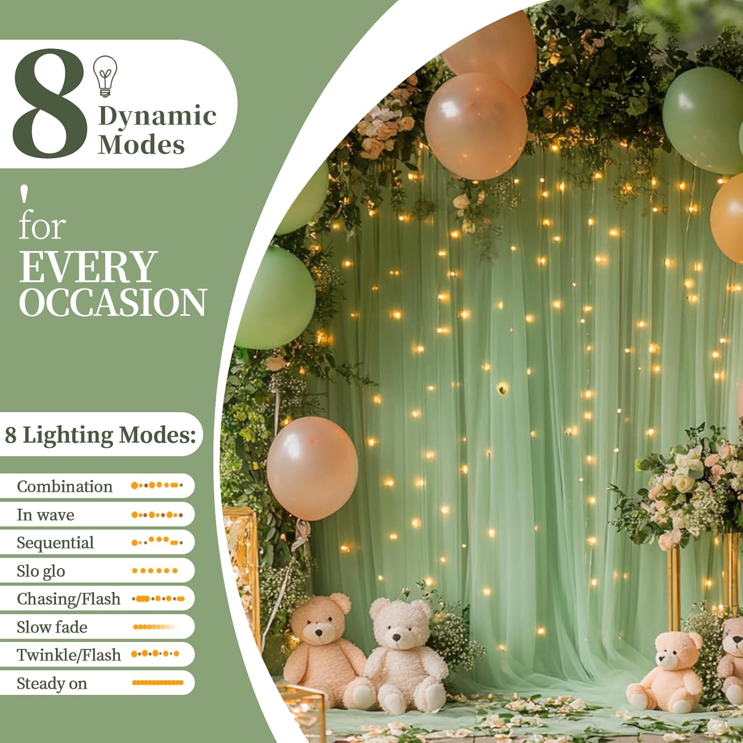 - Complete Event Decor Solution: Includes a 10 x 10 feet string of 300 warm white LED string lights with upgraded tangle-free PVC wiring. USB-powered with a 10ft cord, it’s compatible with adapters, power banks, or laptops. Choose from 8 lighting modes to create a magical and romantic atmosphere for any occasion