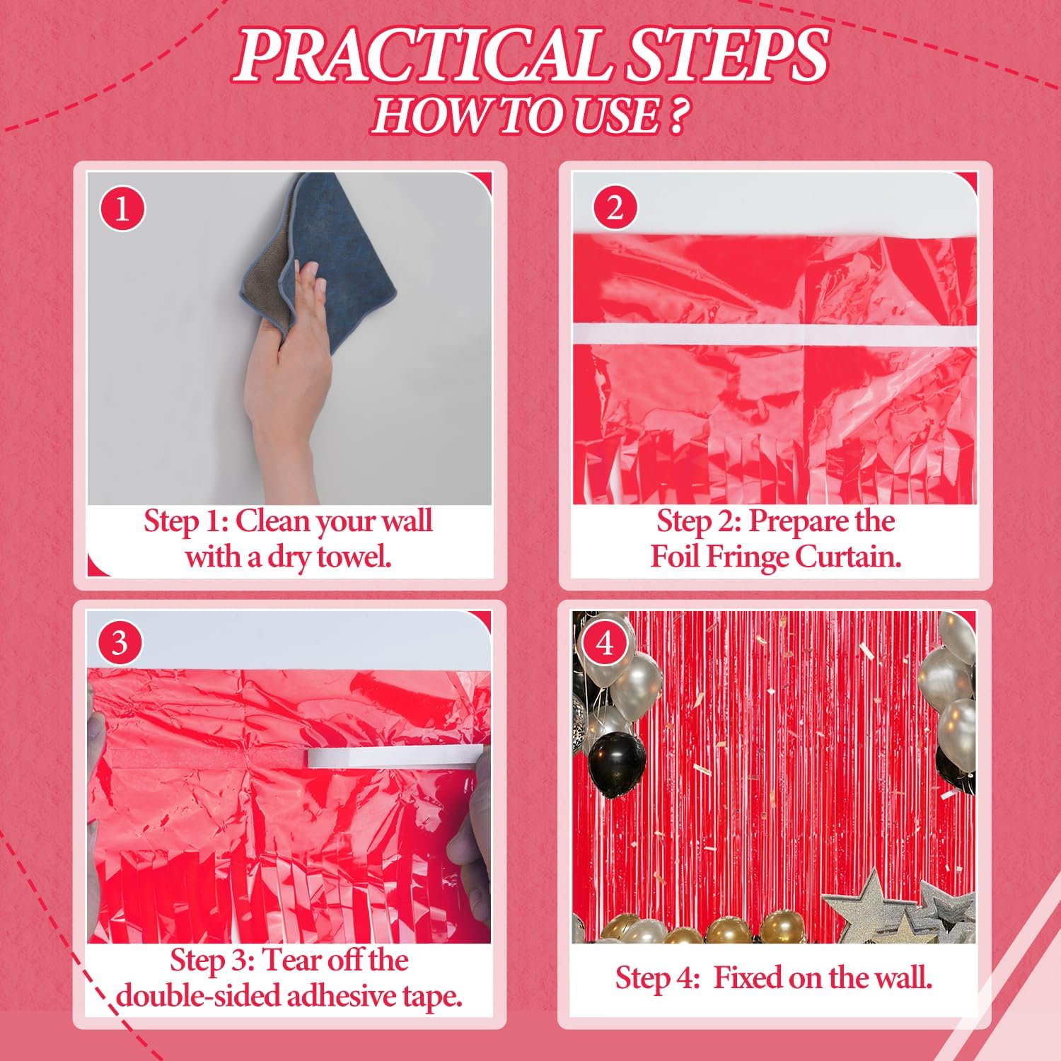 - 【Easy and Convenient Installation】These foil fringe curtains are easy to install and can be quickly hung on smooth surfaces using the included double-sided adhesive tape. No extra tools or materials required.
