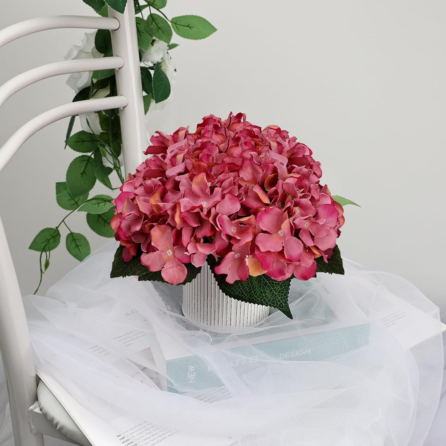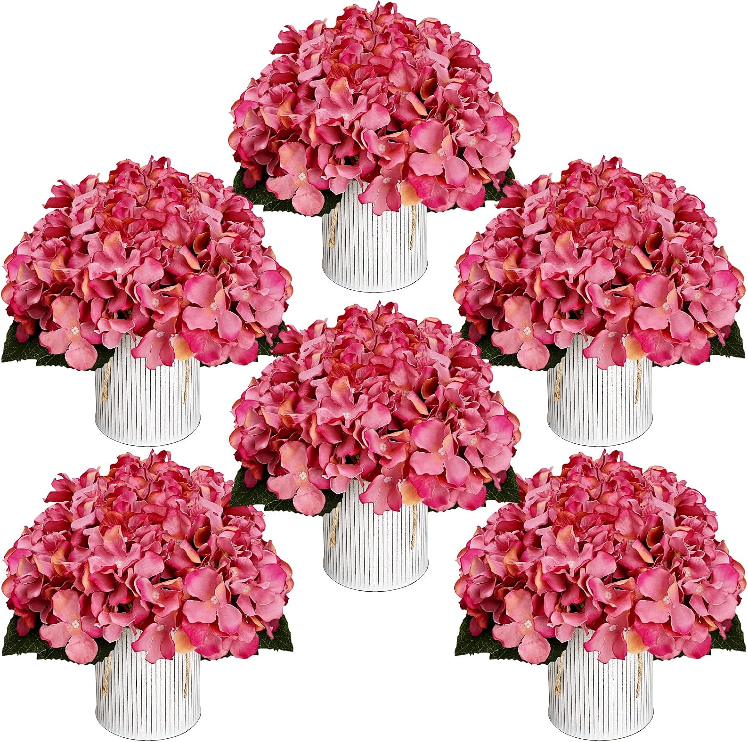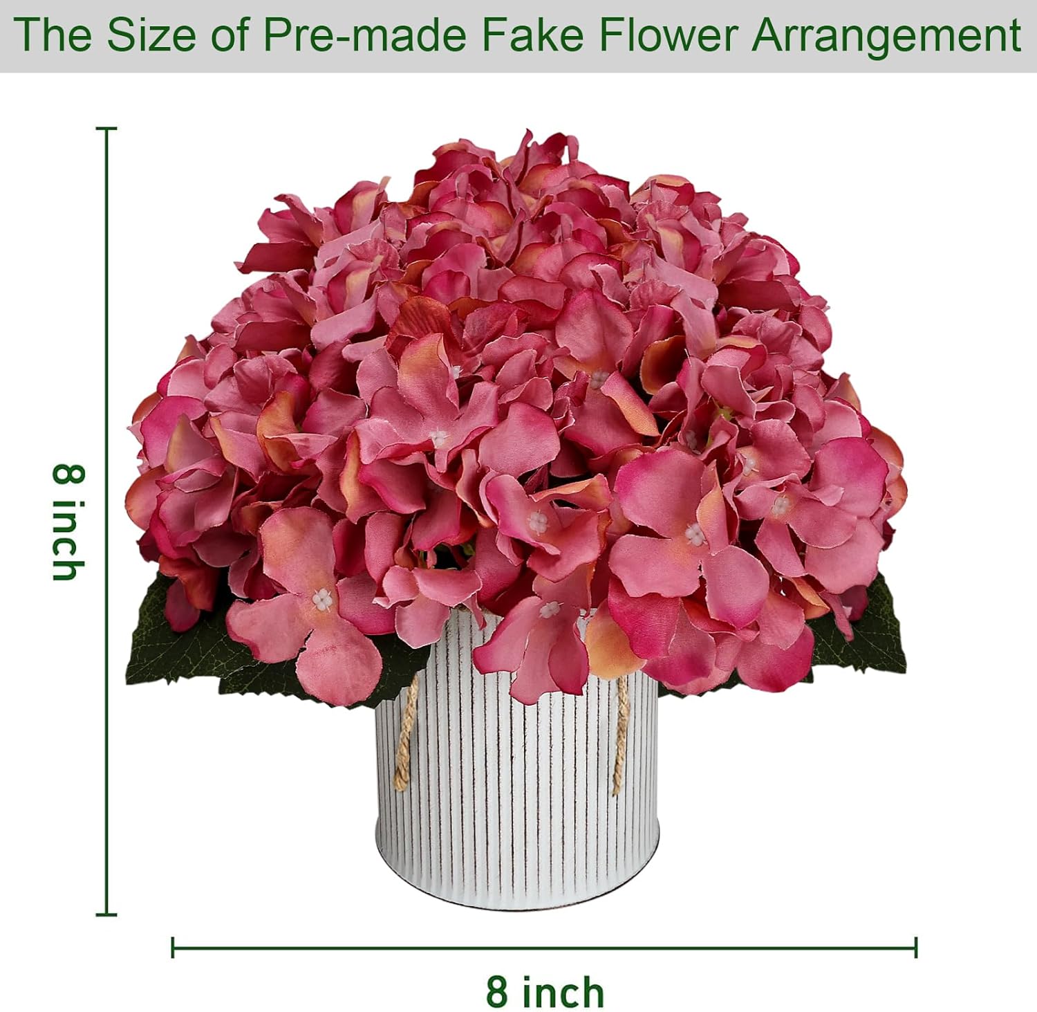 - Pack of 6 pre-made artificial flowers with rustic metal pot for table centerpieces. Consists of high quality dusty pink fake roses and faux hydrangeas.