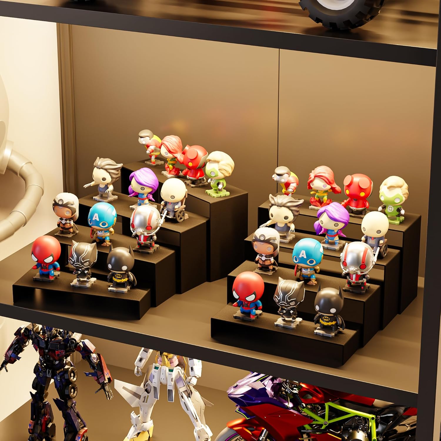 - 【Materials and Size】This black matte metal 8 pieces display stand comes in four sizes, namely 7.8*3*1.2 inches, 8.2*3*2.7 inches, 8.6*3*3.9 inches, 9*3*5.1 inches. Two sets of four sizes of displays stand,simply place the riser on the table, arrange your items, and display them, and you can turn any space into a place to show your personal style and appreciation of art and craftsmanship.