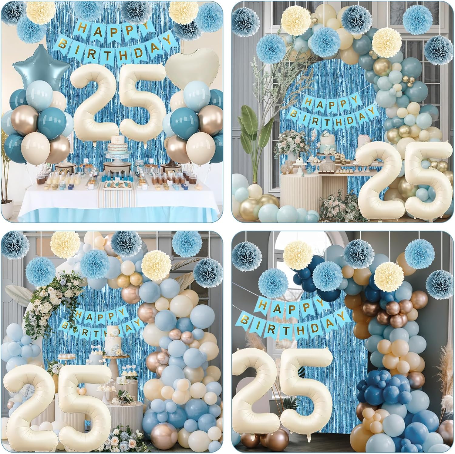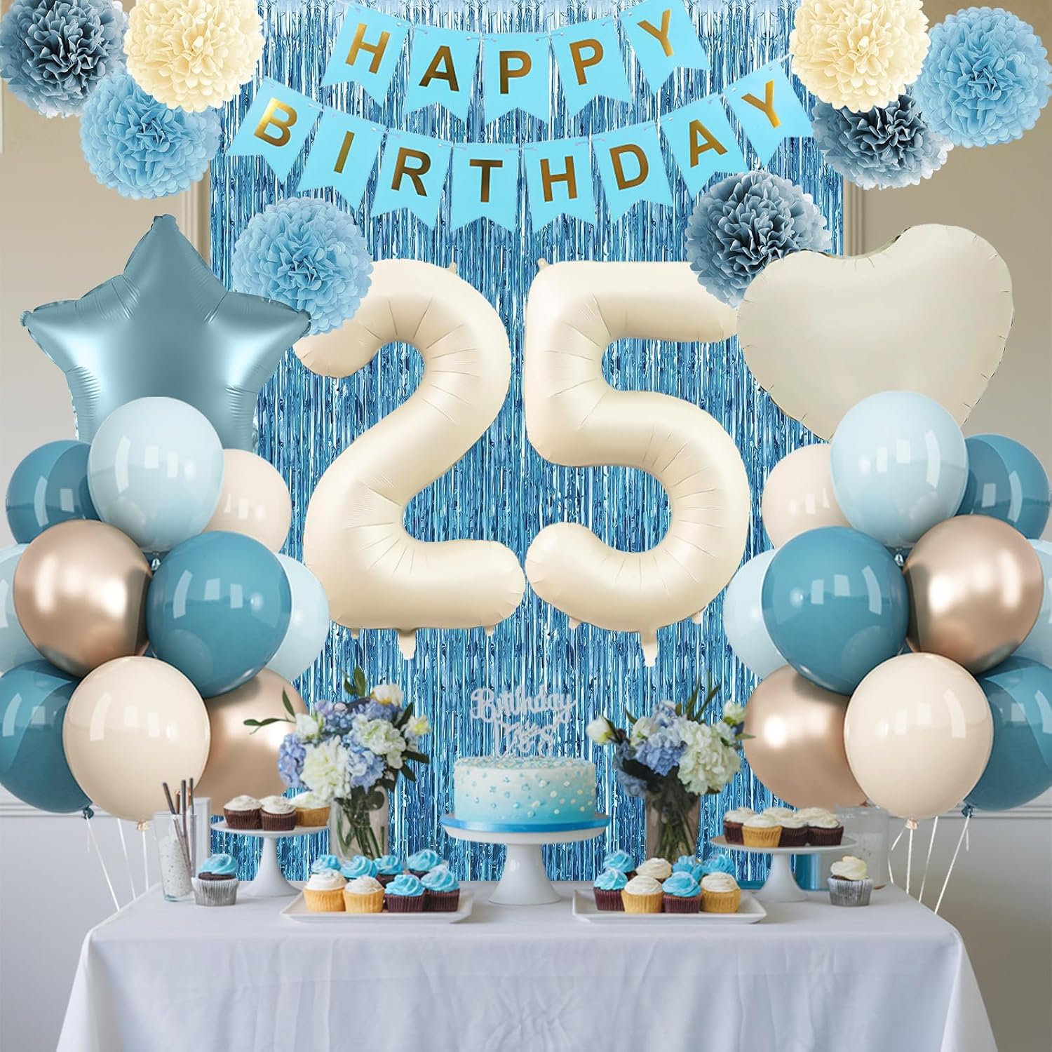 - PACKAGE INCLUDES: 1pc 25 number balloon, 1pc happy birthday banner, 3pcs light blue paper Pom Poms, 3pcs dusty blue paper pom poms, 3pcs nude paper pom poms, 1pc blue fringe curtain, 2pcs dusty blue star foil balloons, 8pcs dusty blue balloons, 7pcs fog blue balloons, 7pcs beige balloons, 4pcs champagne gold balloons, 1pc ribbon