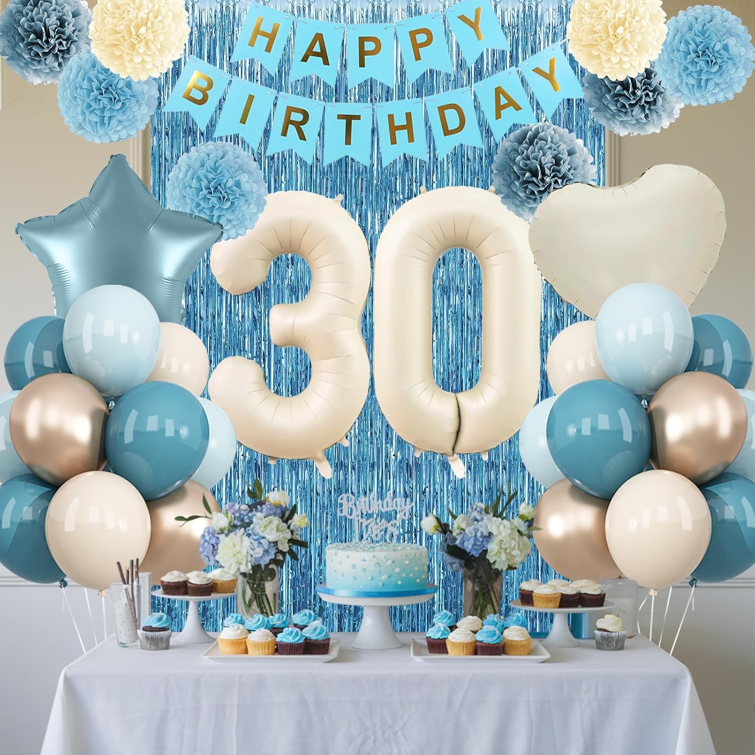 - ALL-IN-ONE DECORATION: Comes with a “30” foil number balloon, includes everything you need: birthday banner, fringe curtain, blue beige gold balloons, star foil balloons, paper pom poms, and ribbon, ideal for 30 year old birthdays, 30th birthday party, photo shoots, and family gatherings, suits both indoor and outdoor setups