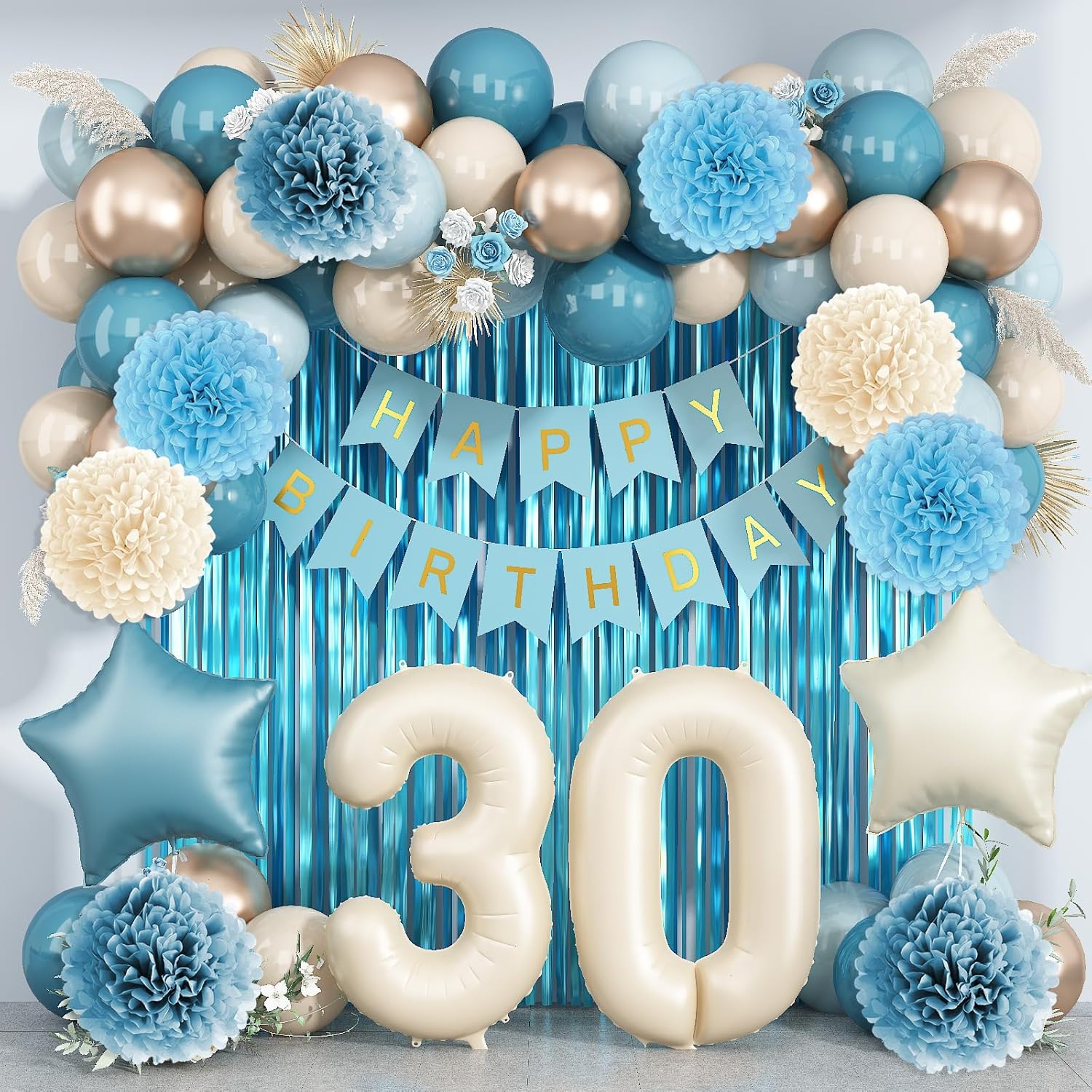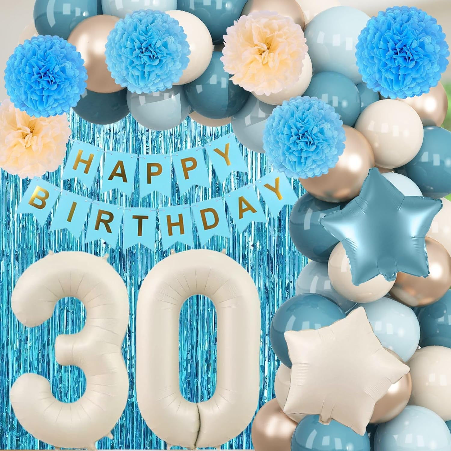 - PACKAGE INCLUDES: 1pc 30 number balloon, 1pc happy birthday banner, 3pcs light blue paper Pom Poms, 3pcs dusty blue paper pom poms, 3pcs nude paper pom poms, 1pc blue fringe curtain, 2pcs dusty blue star foil balloons, 8pcs dusty blue balloons, 7pcs fog blue balloons, 7pcs beige balloons, 4pcs champagne gold balloons, 1pc ribbon