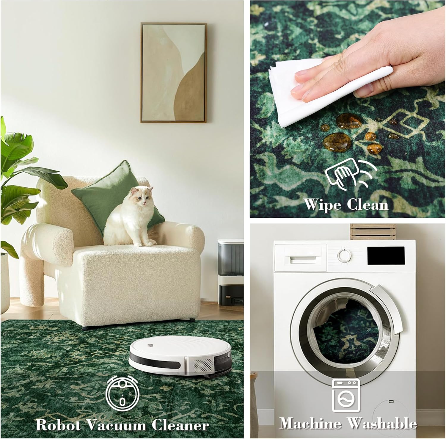 Dark Green Area Rug 2x3 Entryway Rug for Bedroom Bathroom, Non-Slip Low-Pile Washable Distressed Boho Carpet Retro Accent Doormat for Laundry Room Hallway Kitchen 24x36 Inch