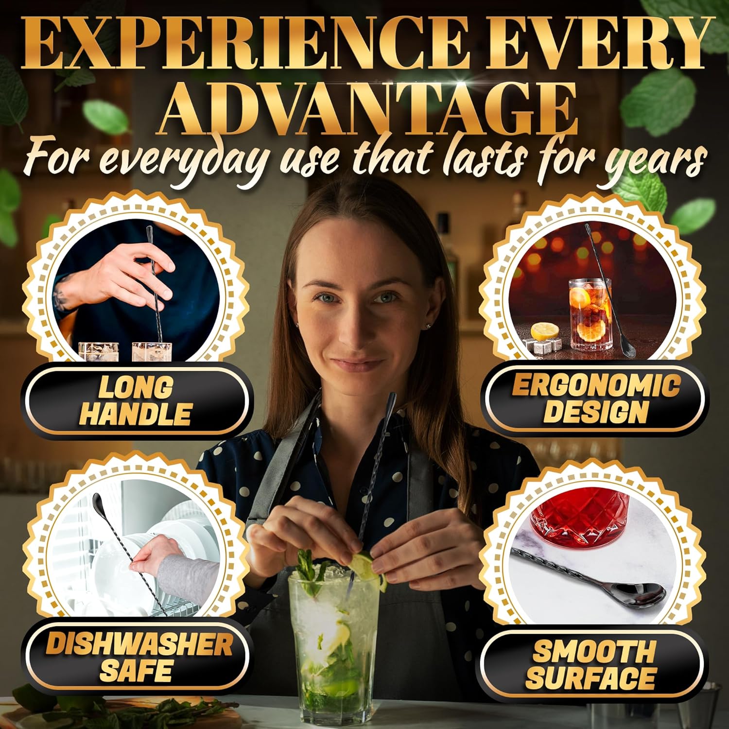 - Complete Cocktail Kit: Our 4-piece set of drink stirrers cocktail is good for all your mixing needs, whether you're making cocktails, iced tea, or coffee drinks – ideal for home or pro bars