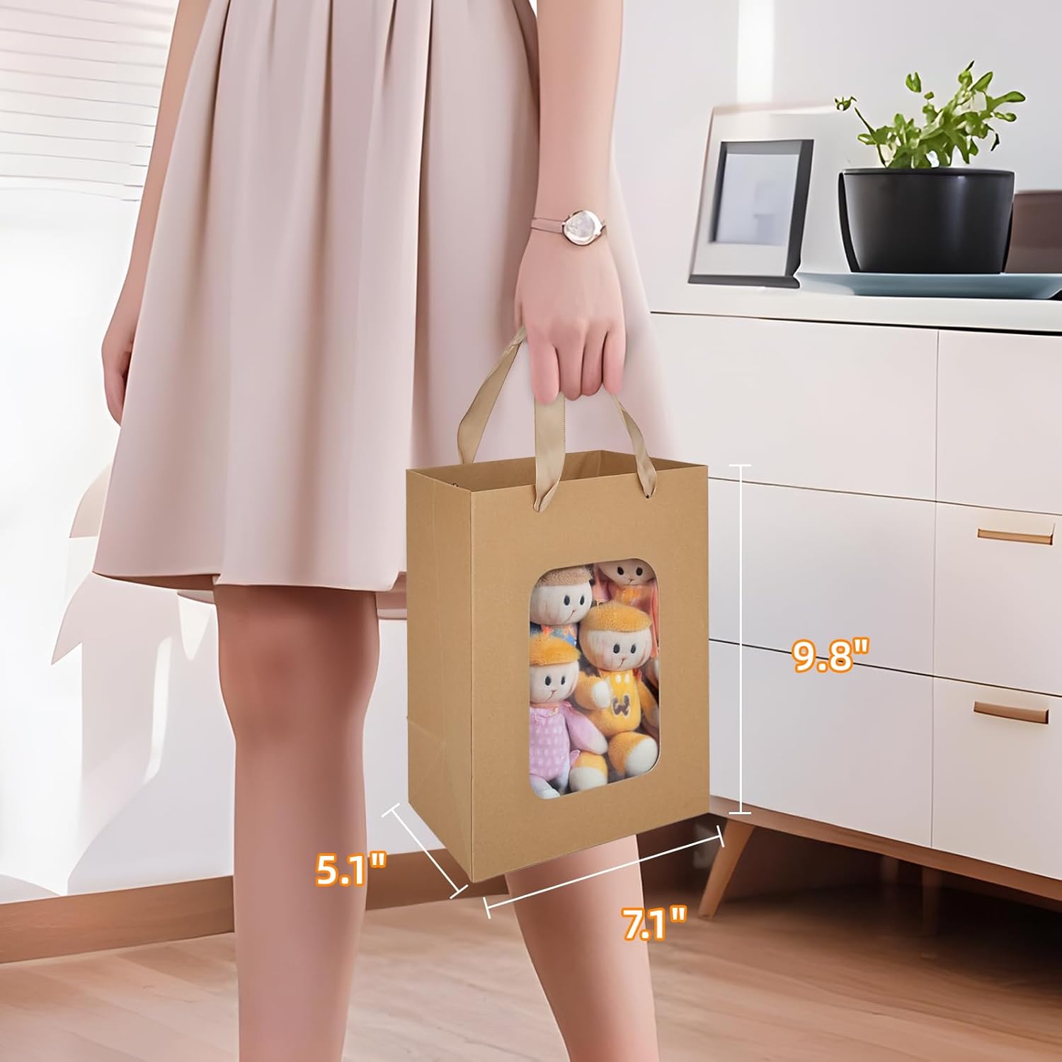 MOXARYSU 3 Pcs Brown Gift Bags with Clear Window: 9.8x5.1x7.1 Inch Medium Kraft Paper Bags with Handle For Party Business Birthday Wedding