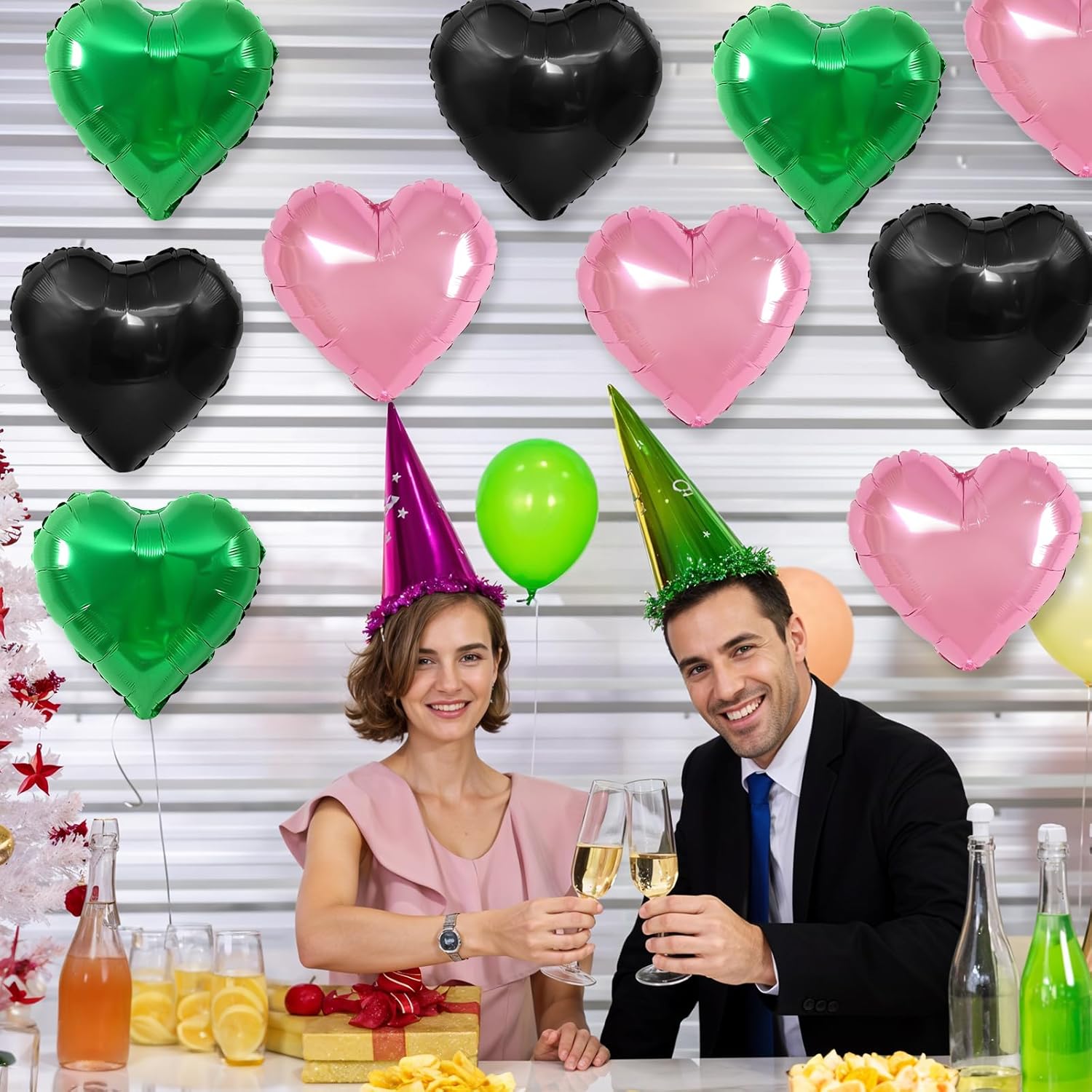 Black Green Pink Heart Balloons,12Pcs 18Inch Pink Green Heart Shaped Foil Helium Balloons for Baby Shower Witch Themed Birthday Anniversary Party Decorations