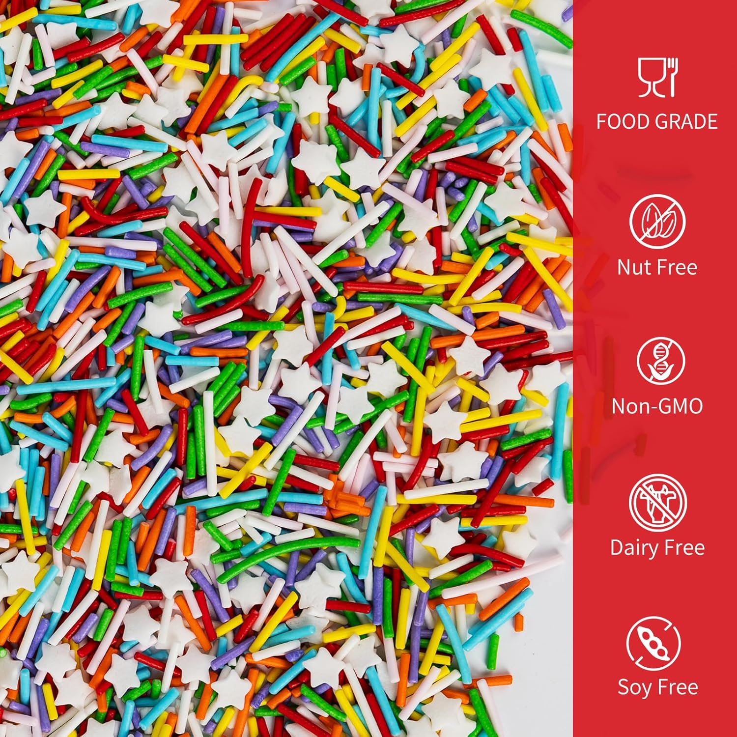 - Food-grade Sprinkles: Preservative Free, Nut Free, Dairy Free, Chemical Free, Soy Free, Non-GMO. Produced using food-safe standards, the process does not come into contact with allergenic substances and uses Tamper-proof food label