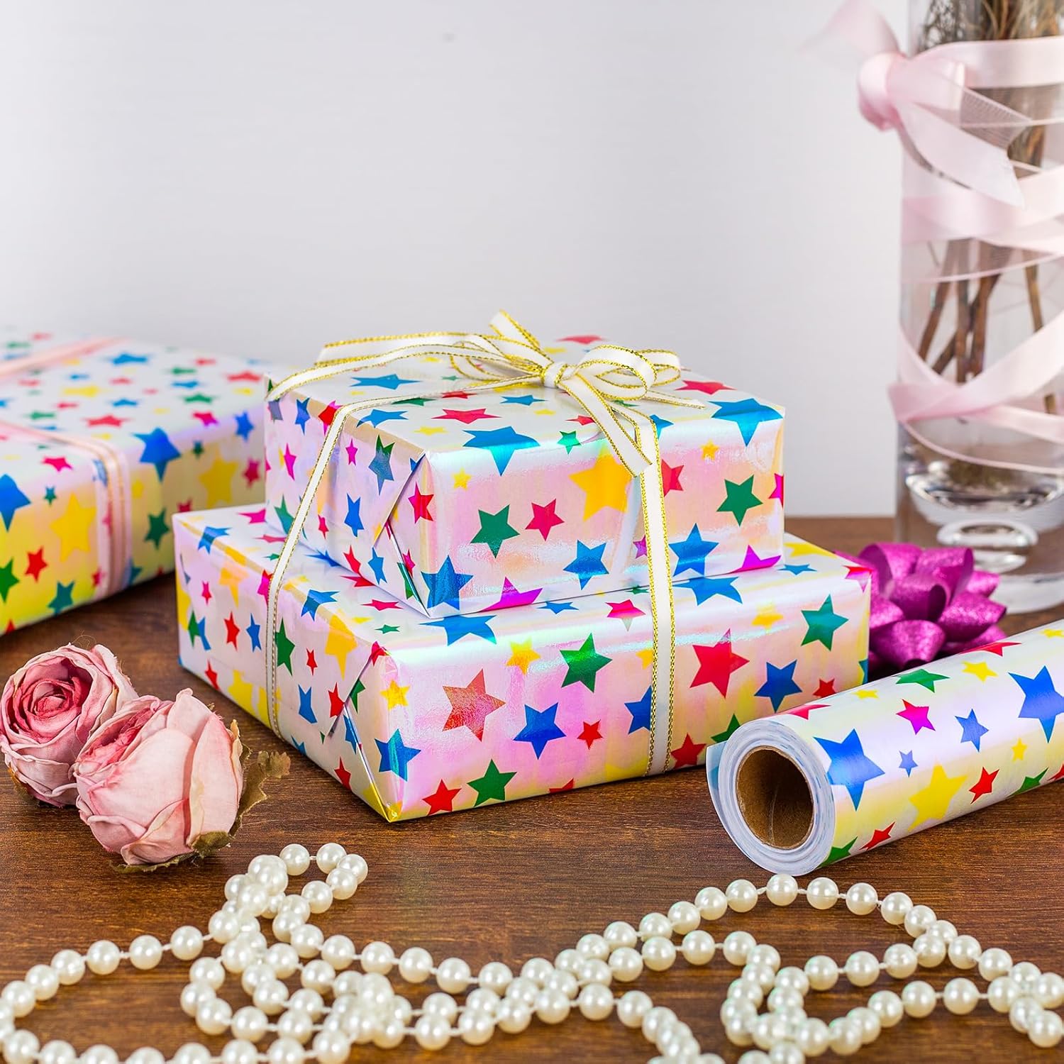 - Iridescent Wrapping Paper: Features a stylish pink star pattern, making your gift wrap stand out and look extra special. The back has grid lines for easy cutting and less waste