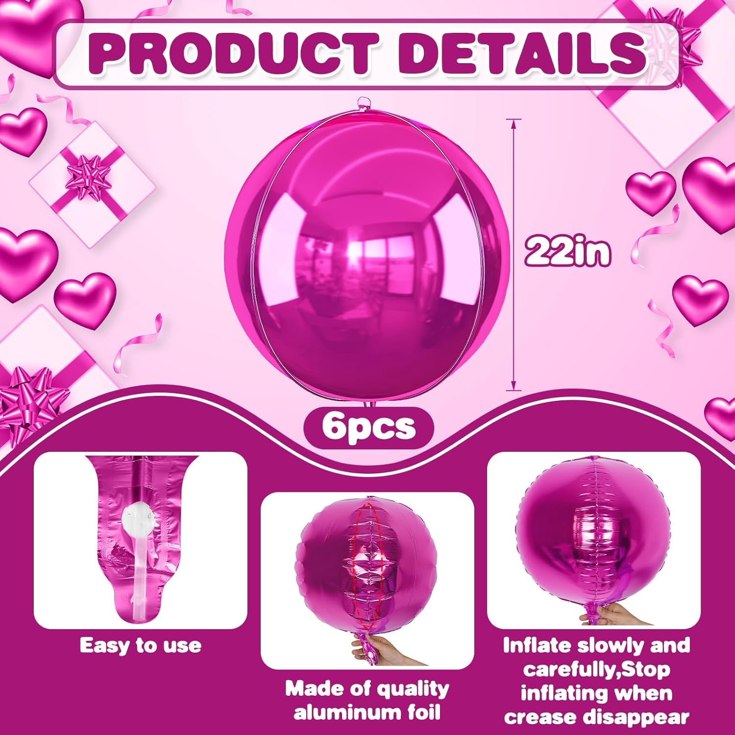 - 【6PCS ROUND BALLOONS】package include 6pcs 22inch Hot Pink round giant 4D foil balloons. The Hot Pink round balloons are large enough to help you better decorate your party.