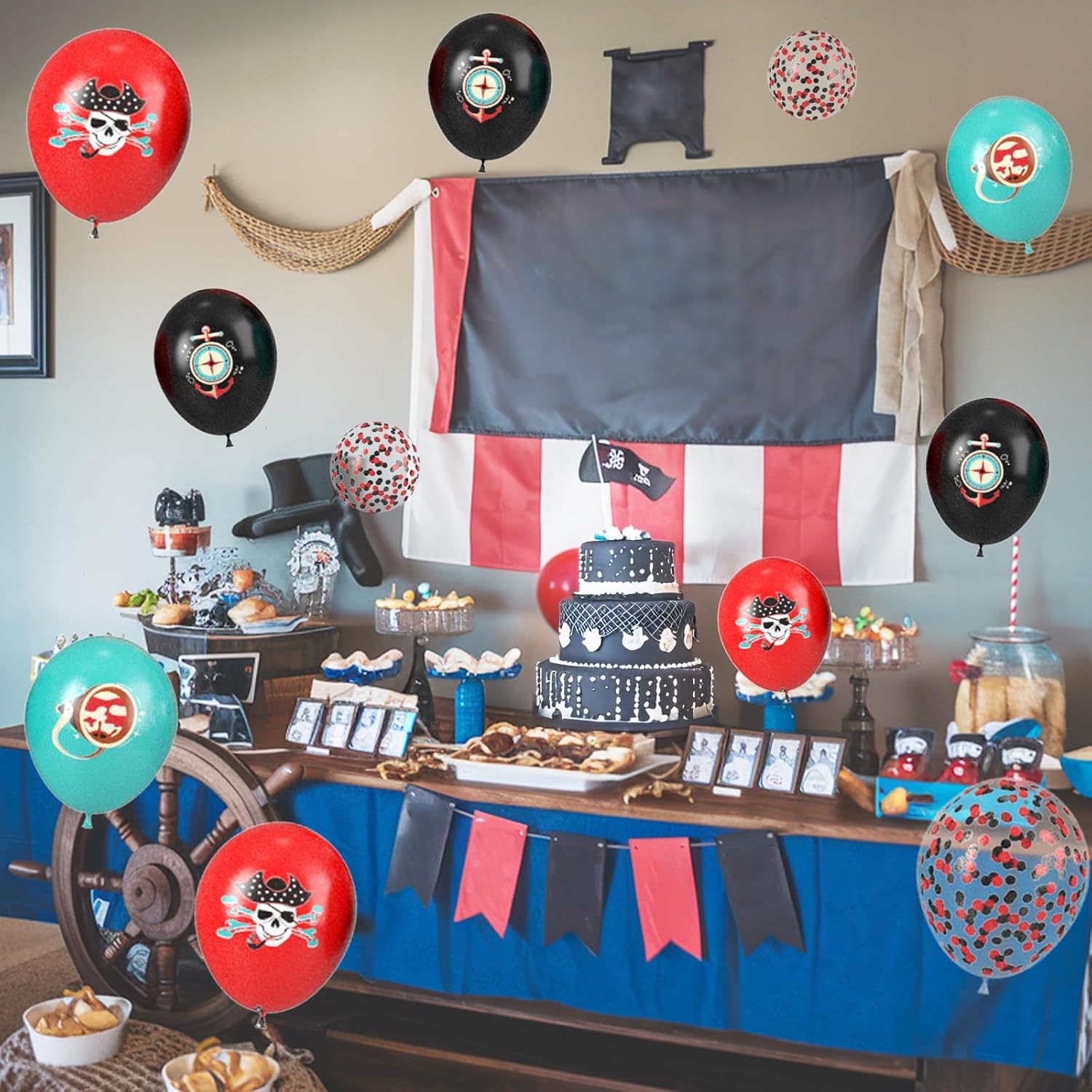Pirate Balloons, 12 Inch Teal Black Red Confetti Balloons with Pirate Design for Boy Pirate Ship Theme Birthday Party Sea Sailing Graduation Halloween Baby Shower Decorations