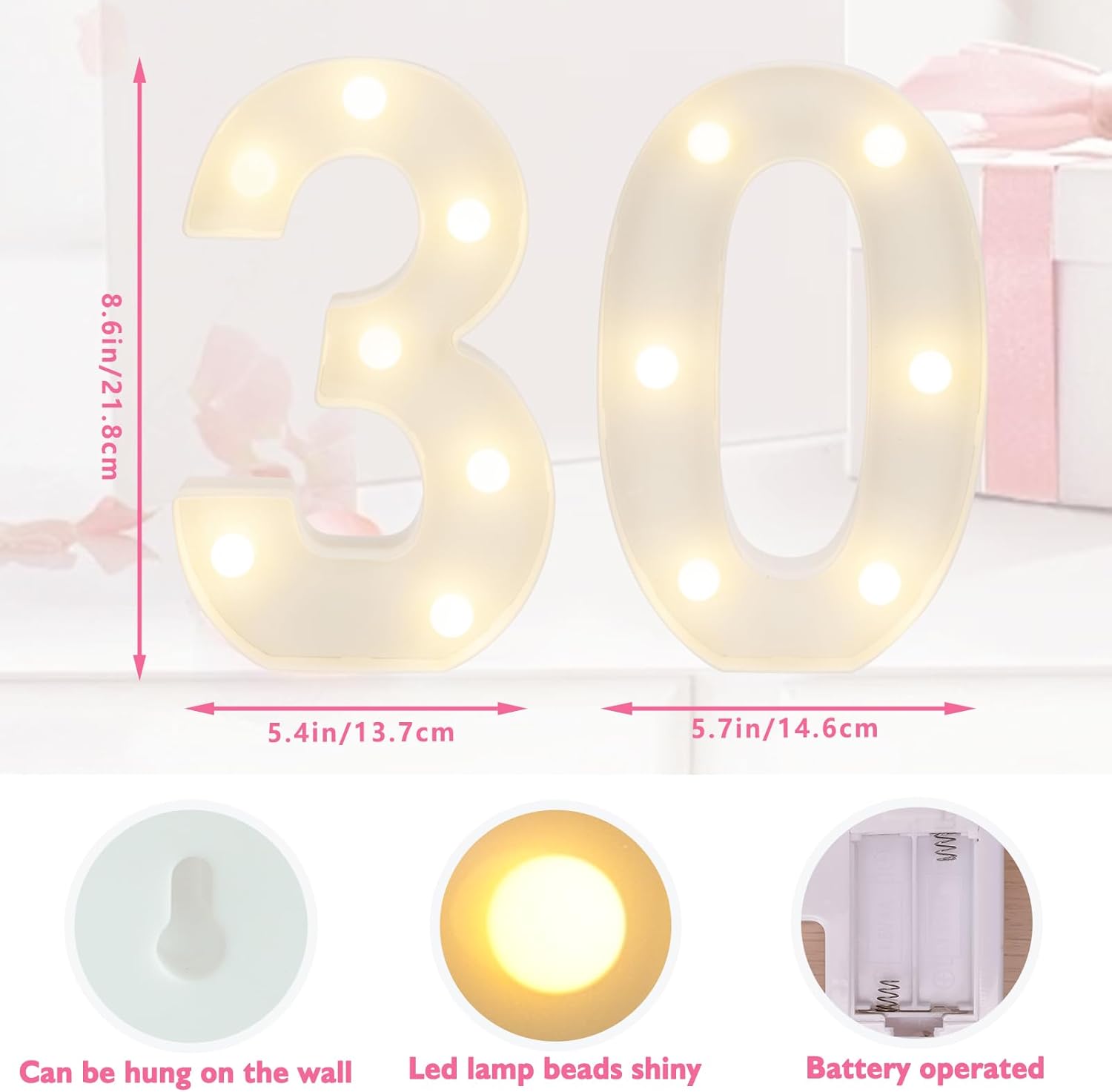- 【Light Up Your Birthday】 Light up number lights are great birthday party supplies and decorations, perfect for all kinds of scenes and memorable moments. Light up your birthday party by spelling out “30” with our number lights, light up the wonderful moments, warm white lights create a cozy atmosphere, make your 30th birthday party more memorable and sparkling!