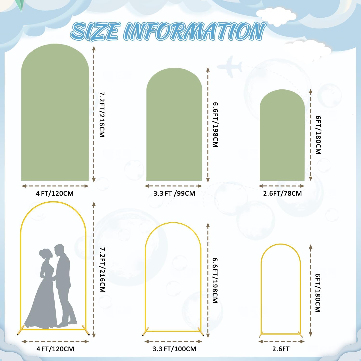 - 🧸【Size Information- Arch Backdrop Stand and Cover Set】Arch stand and cover set includes 3 gold metal arch backdrop stands and 3 sage green arch cover in sizes 7.2FT x 4FT(H x W), 6.6FT x 3.3FT(H x W) and 6FT x 2.6FT(H x W). The backdrop arch stand with cover is certain to meet your decoration needs and add a charming look to your celebrations.