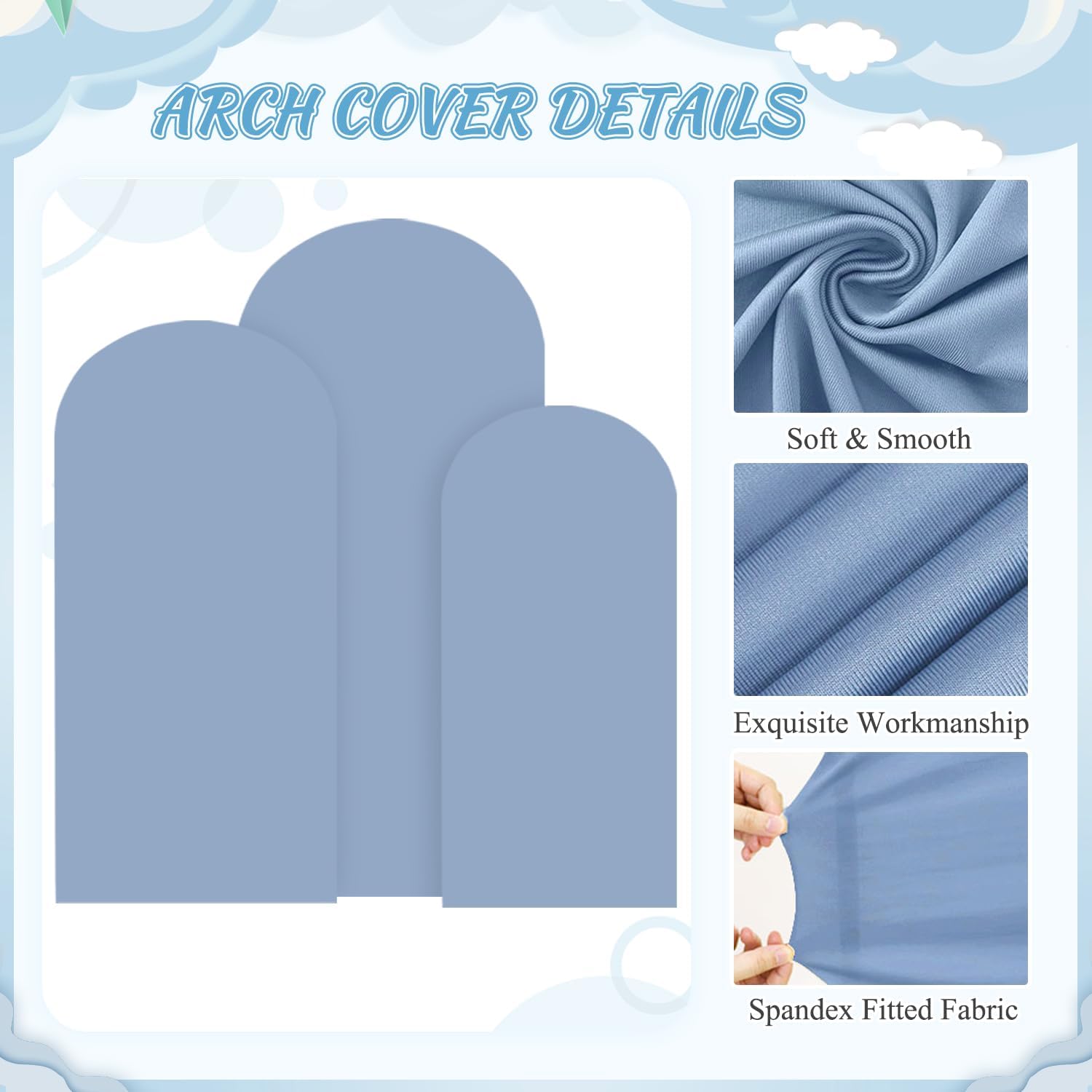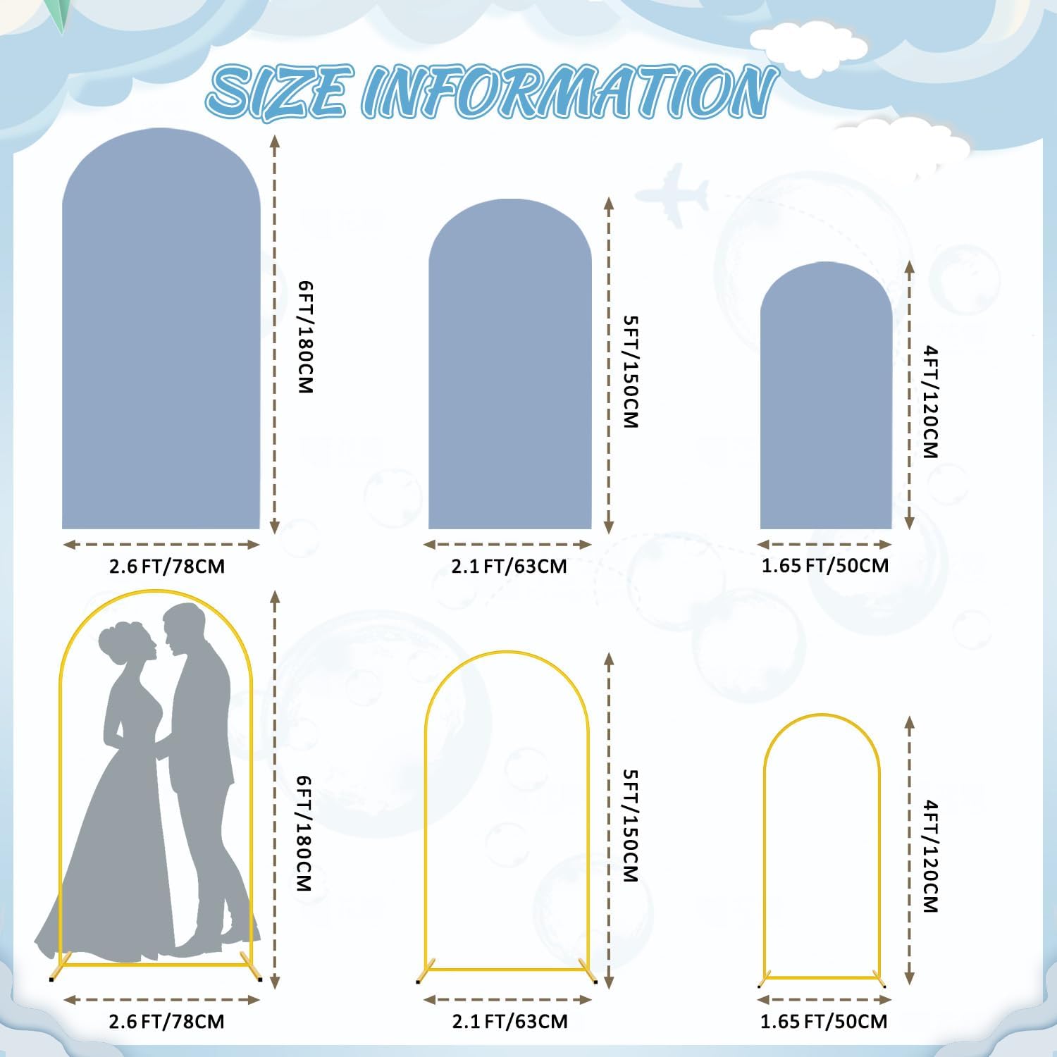 - 🧸【Size Information- Arch Backdrop Stand and Cover Set】Arch stand and cover set includes 3 gold metal arch backdrop stands and 3 dusty blue arch cover in sizes 6FT x 2.6FT(H x W), 5FT x 2.1FT(H x W) and 4FT x 1.65FT(H x W). The backdrop arch stand with cover is certain to meet your decoration needs and add a charming look to your celebrations.