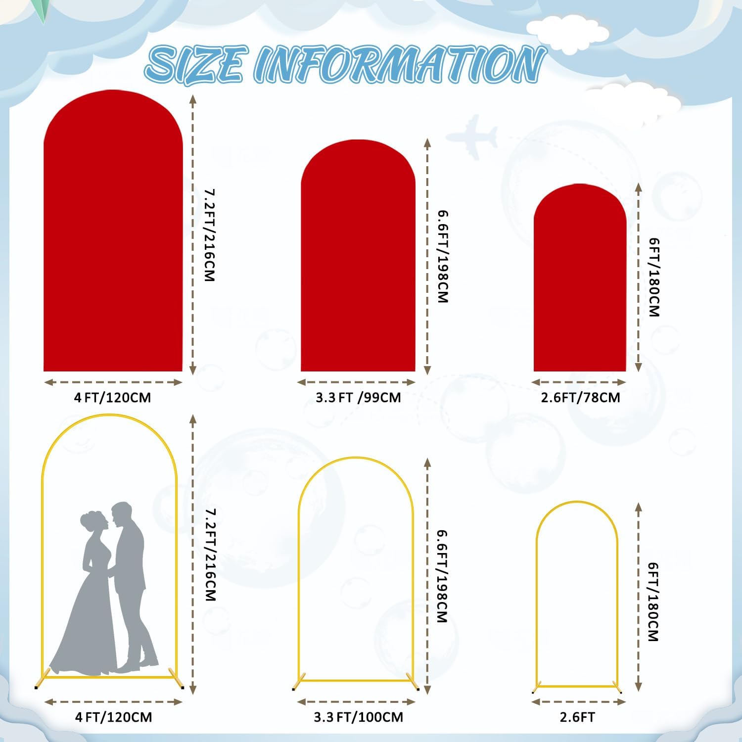 - 🧸【Size Information- Arch Stand and Cover Set】Arch stand and cover set includes 3 gold metal arch backdrop stands and 3 red arch cover in sizes 7.2FT x 4FT(H x W), 6.6FT x 3.3FT(H x W) and 6FT x 2.6FT(H x W). The backdrop arch stand with cover is certain to meet your decoration needs and add a charming look to your celebrations.