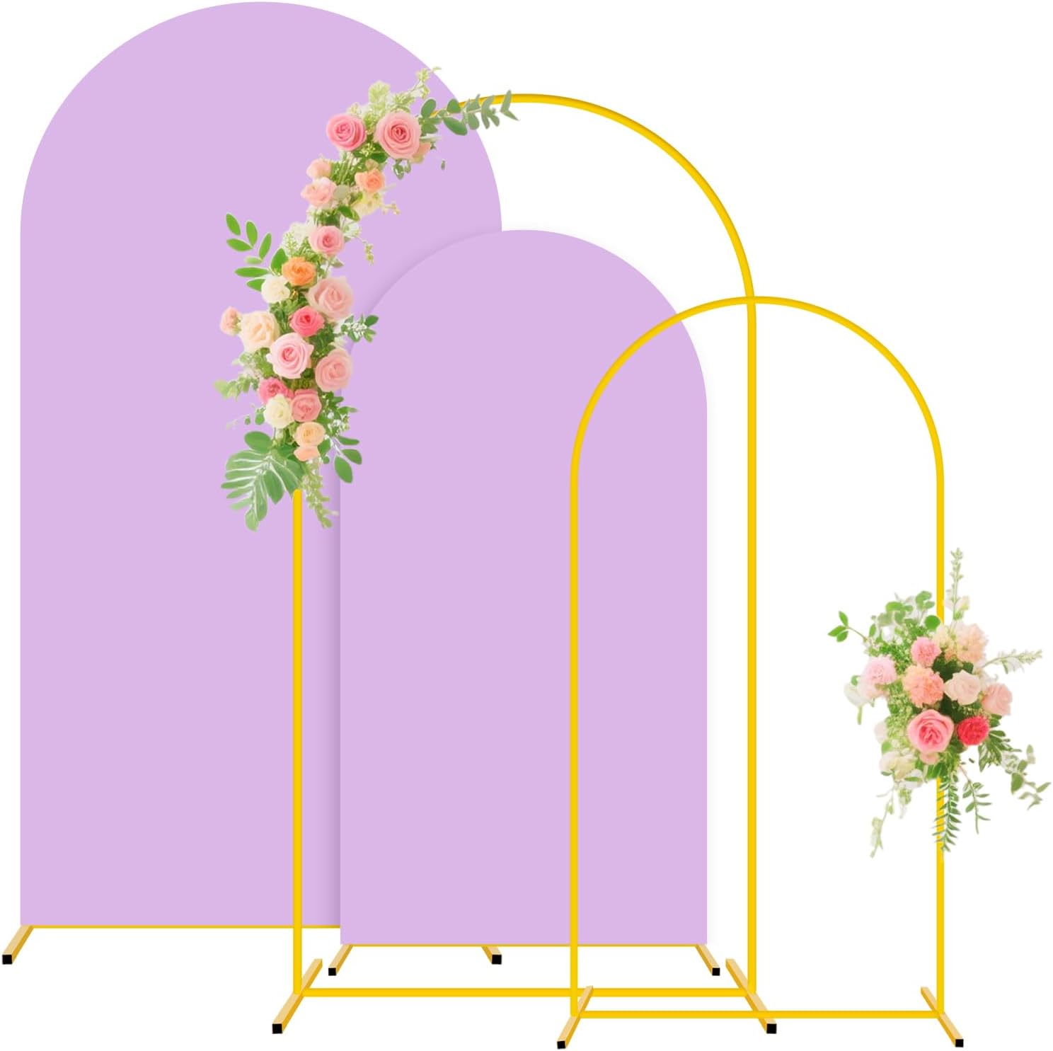 - 🥂【Package Included - Metal Arch Backdrop Stand and Cover Set】You will receive 2 gold metal arch backdrop stand and 2 lavender arch cover. Size: Size: 7.2ft H x 4ft W, 6ft H x 2.6ft W. Let's create unforgettable moments with our arch backdrop stand cover!