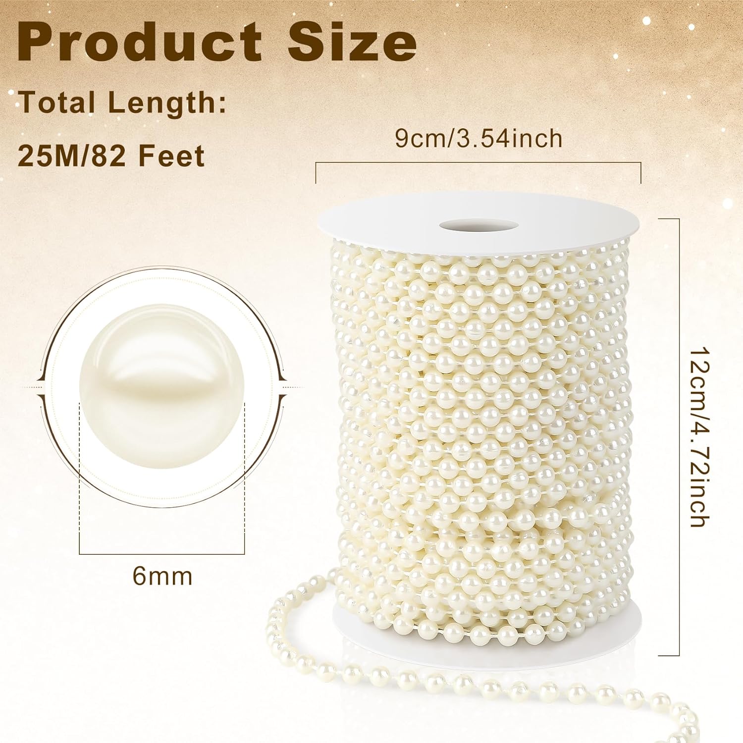 - Pearl Beads Garland Size: You will receive 1 roll of string of pearls, each roll has a total length of 82 feet/25 metres with spool; the diameter of the pearls is 6mm and the spacing between the strands is evenly distributed