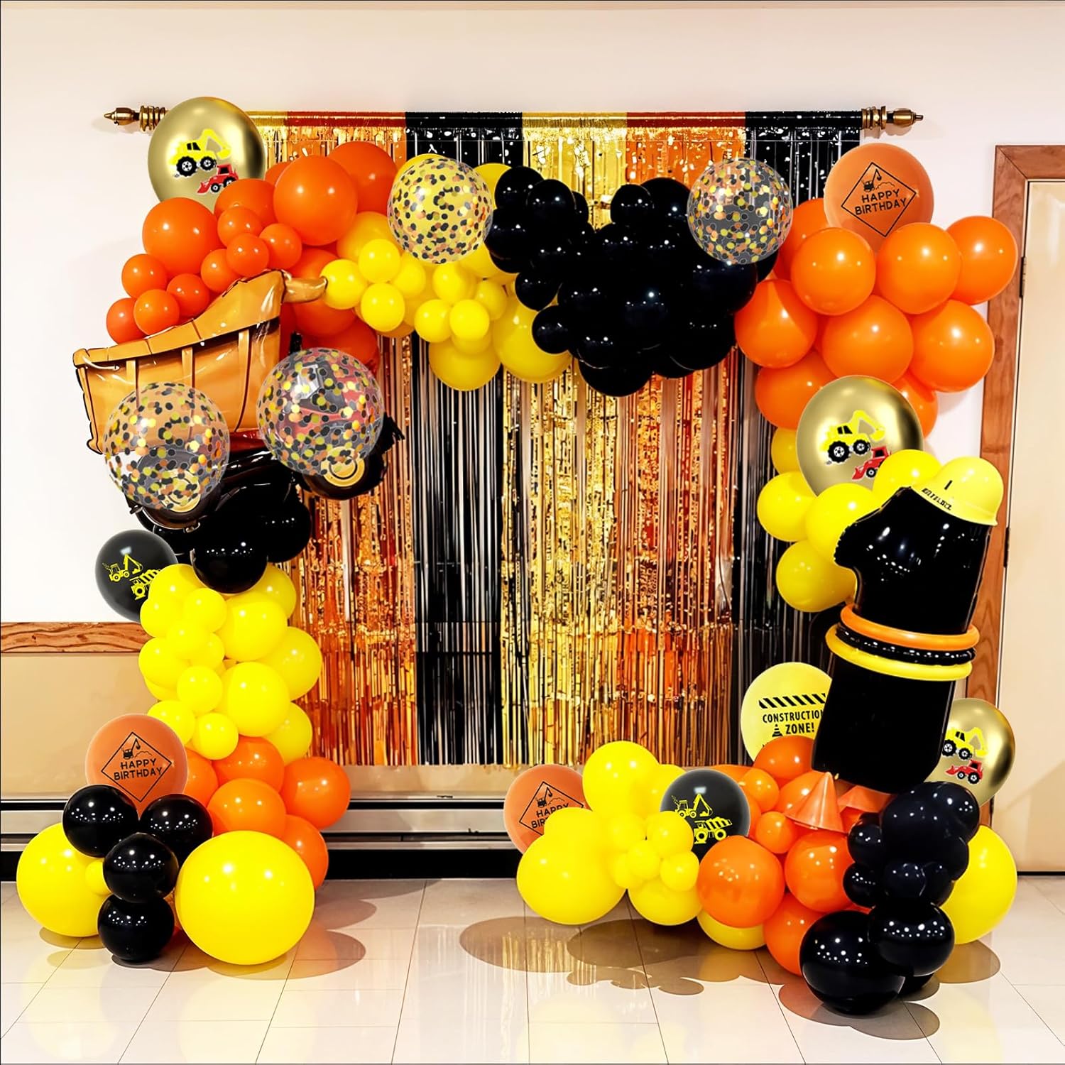 - 【Construction Party Decorations】This 35pcs 12-inch excavator balloon pack includes 7pcs gold construction vehicle design balloons, 7pcs yellow construction sign design balloons, 8pcs orange construction birthday design balloons, 8pcs black construction design balloons,5pcs black orange and yellow confetti balloons, and 1 roll white ribbon. Great for construction-themed parties, construction birthday party decorations, or excavator birthday decorations for little builders.