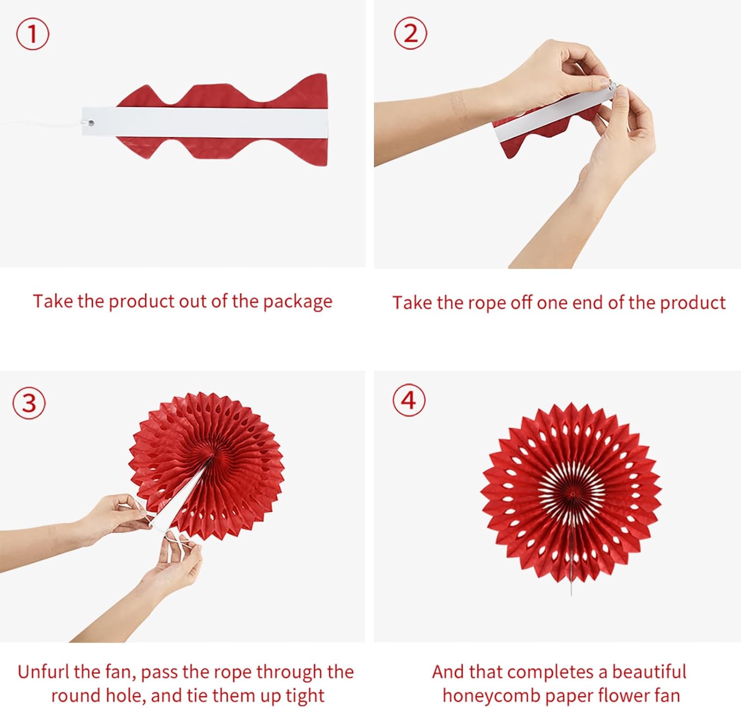 - 【Easy to assemble and uniquely designed 】These hanging paper fans have a hanging string attached,just unfold the paper flower fan and fix it with the rope of the paper flower fan, then you can hang it to your favorite place and decorate your party perfectly in a few minutes.