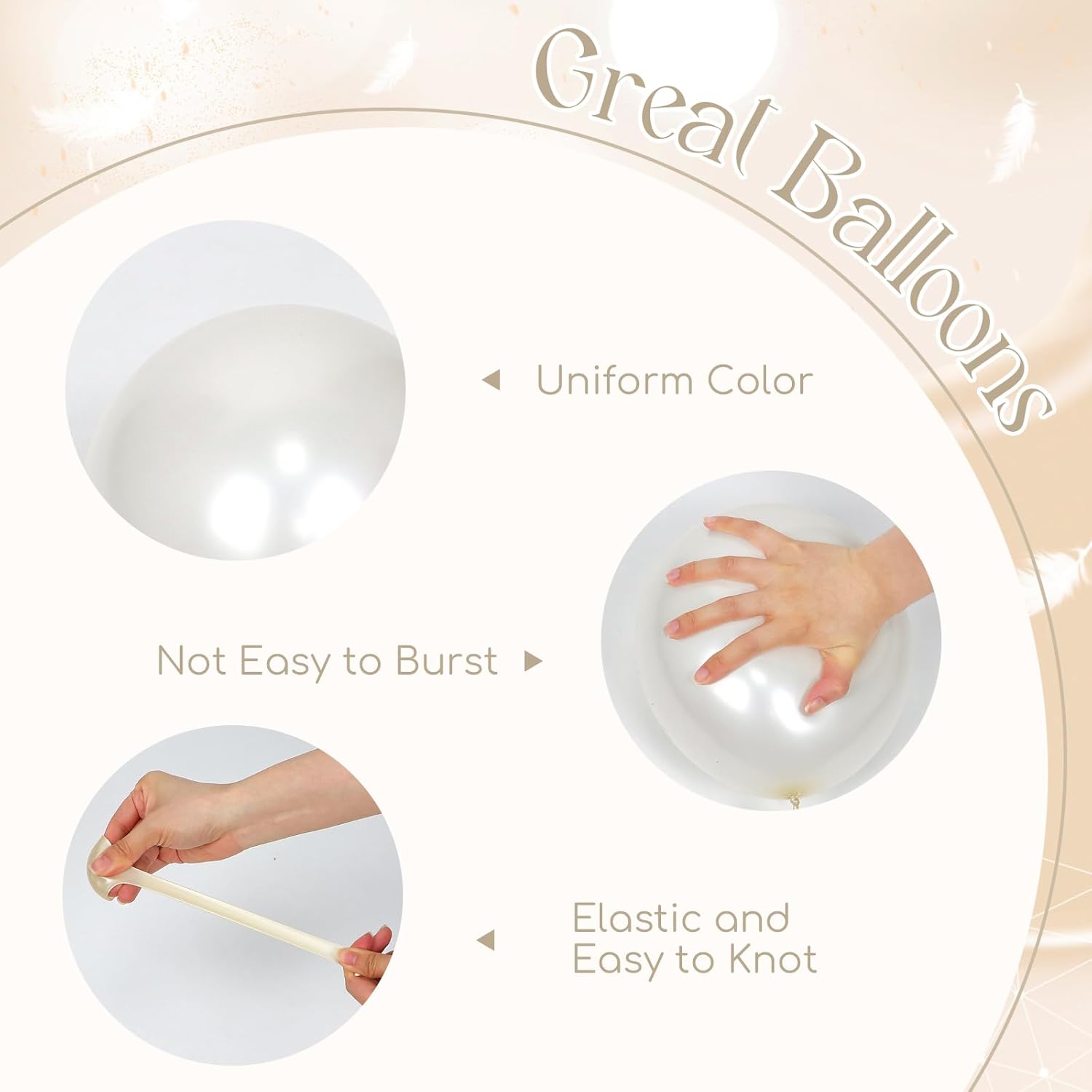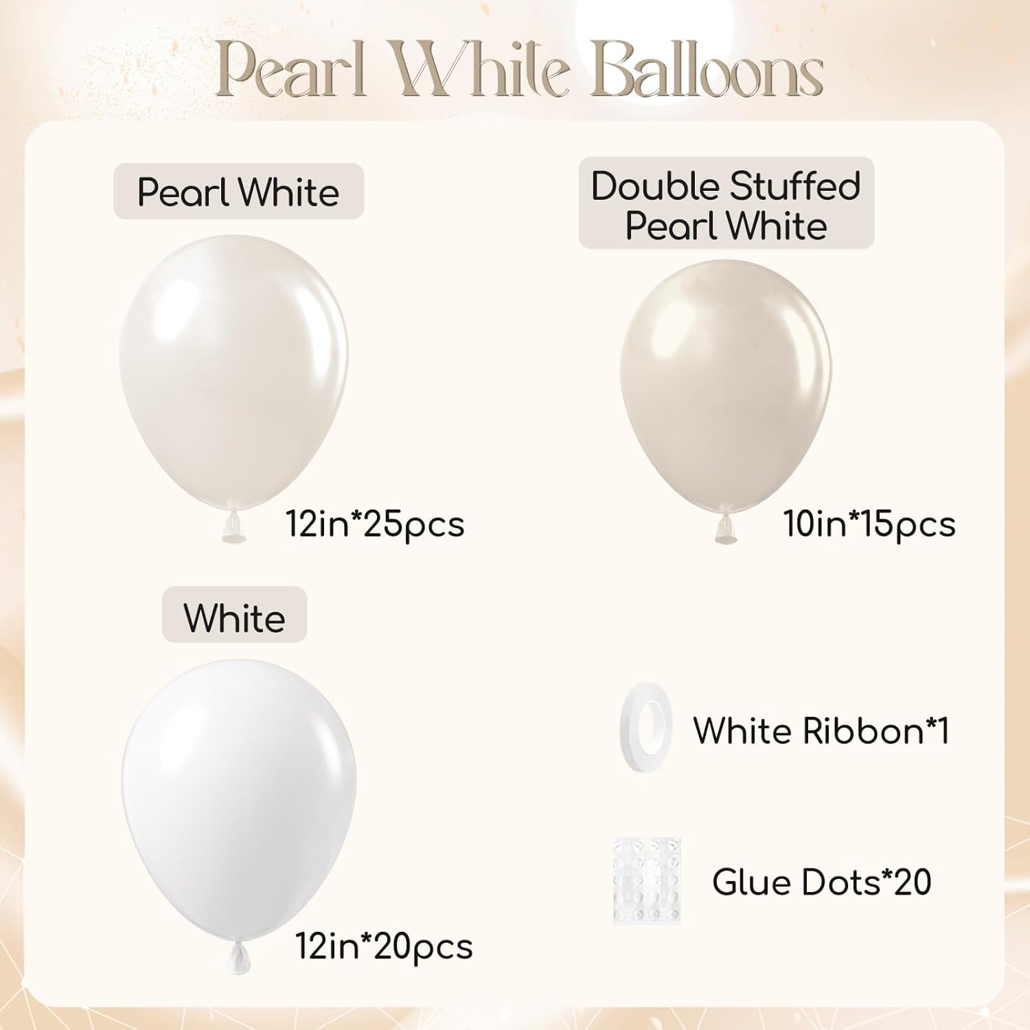 - What You Will Get: The package includes pearl white balloons include 12inch white balloonsx20, 12inch pearl white balloonsx25, 10inch pearl white double stuffed balloonsx15, white ribbonx1, glue dotsx20