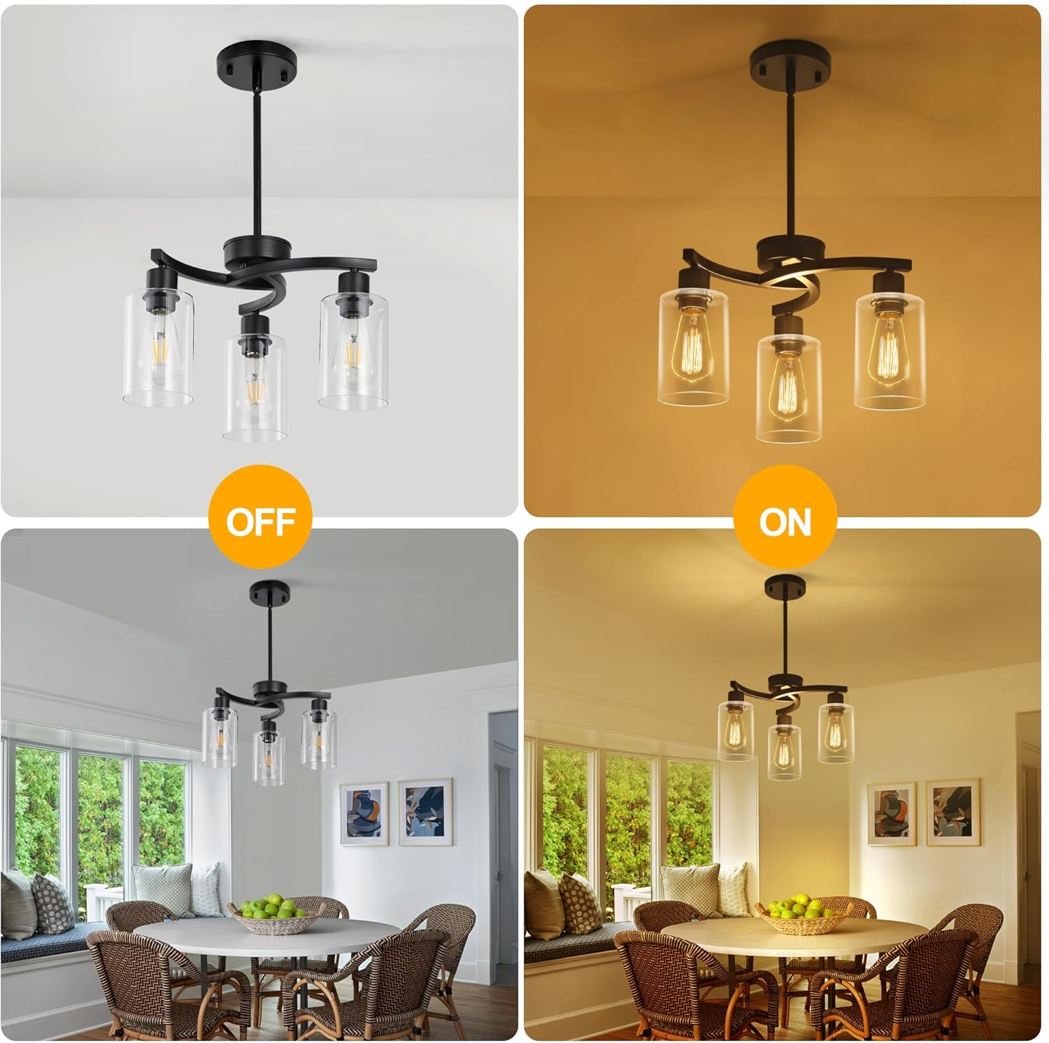 - Modern Style: Glass pendant light has 3 arms that radiate outward from the central arc, presenting a simple but not simple beauty. The body of the black chandelier is made of high quality matte black metal with a fine polished surface. The clear glass shade not only ensures the soft scattering of light, but also complements the cold and hard texture of the metal, making the whole modern glass light fixture both powerful and delicate. The downward-facing glass shade does not easily accumulate dust and is easy to clean.
